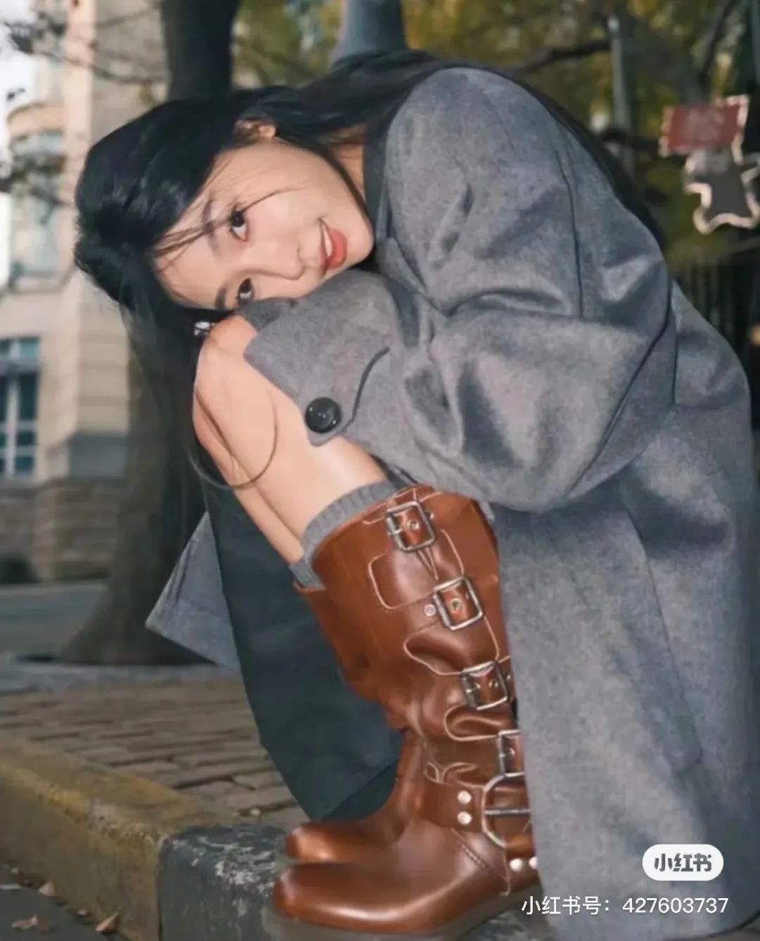 这种靴筒略宽松的、长度差不多快到膝盖的,可以说是最遮肉显腿直的。