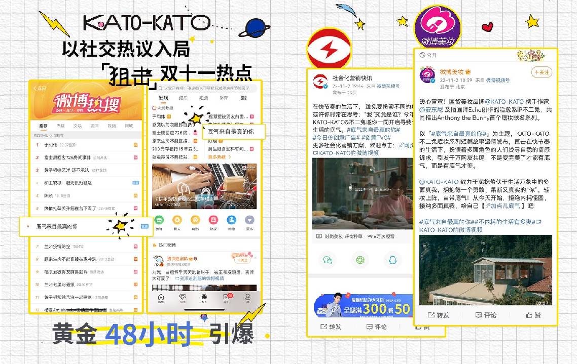 产品自身的高品质,以及IP形象的深入人心,使得KATO-KATO X 不二兔联名系列一经上市,便获得了广大消费者的认可。2022年双十二期间,KATO-KATO X 不二兔联名系列粉底液登上电商排行榜哑光粉底液榜前10名,KATO-KATO X 不二兔联名系列定妆喷雾登上天猫榜单定妆喷雾榜第15名,热销榜前18名。相关联名话题自2022年10月上线起,3次登上微博全国热搜榜,连续36小时霸榜第一,话题阅读总量超4.3亿人,讨论总量超23.3万人。