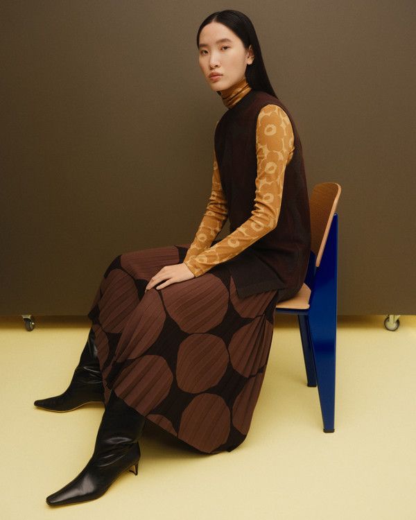 “我设计新款印花的时候,考虑要和之前的系列建立起一种连续性。我的目标是既要打造出全新的设计,也要囊括Marimekko经典隽永、为人熟知的元素。2023秋冬系列的印花设计灵感源于建筑,却同时包含有机物的本质。这种建筑美学源于我所设想的三位女性:她们来自不同的设计年代,拥有各自的审美和风格。在设计印花图案时,我会思考这些女性的家中可能会有怎样的织物或面料,也会想象她们挂在墙上的艺术品以及她们珍视的个人物品。”印花设计师Antti Kekki描述道。