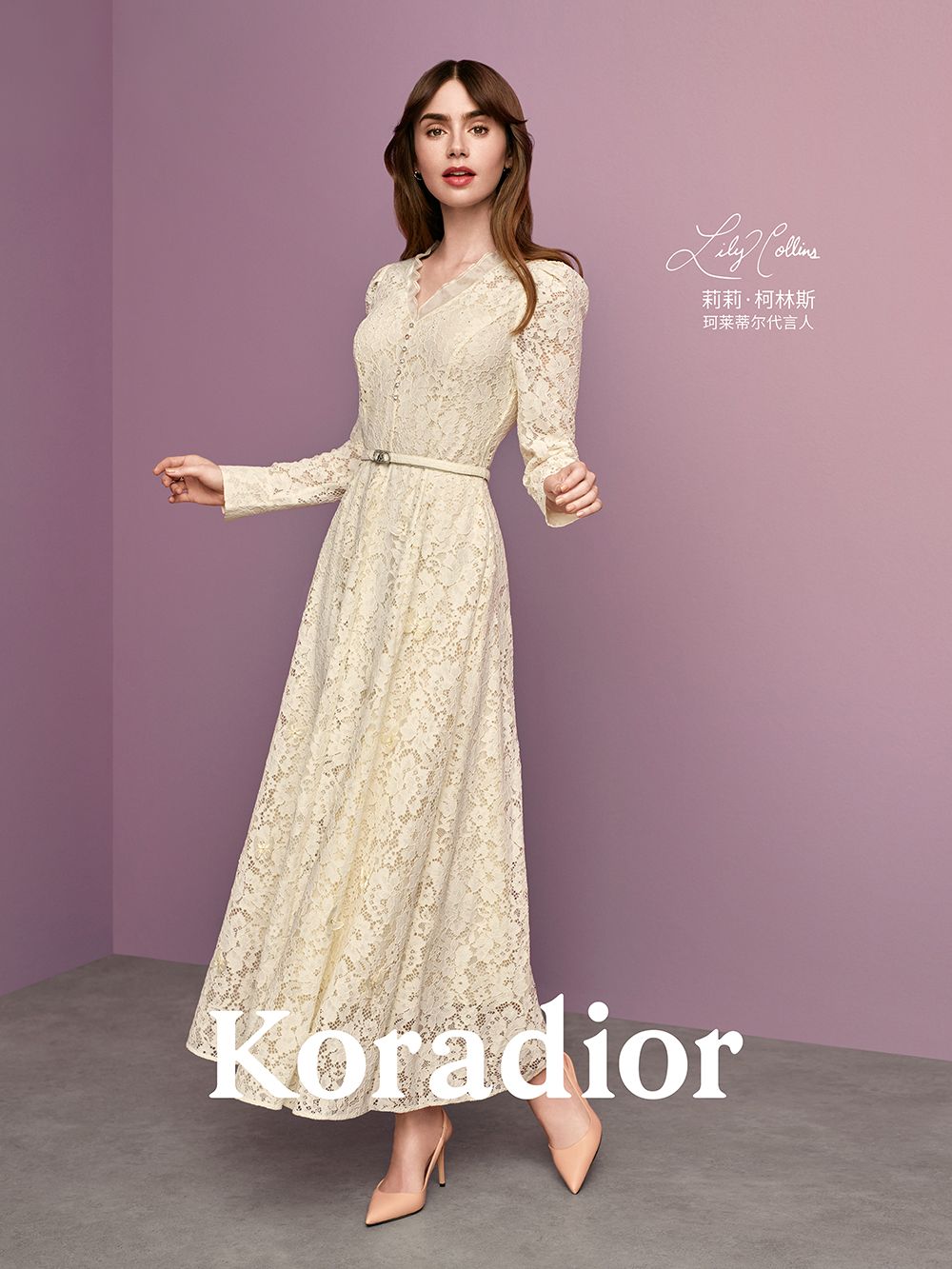 珂莱蒂尔Koradior自2007年成立之初就将浪漫植根于品牌基因中,将独具新意的独创花型、极具女人味的蕾丝面料等浪漫元素融于时装之中,致力于缔造属于中国女性之美,倡导“闲情雅质“的生活美学,而莉莉·柯林斯Lily Collins所展现的正是珂莱蒂尔Koradior女性的最佳状态,她是珂莱蒂尔Koradior的代言人,更是浪漫的代言人。