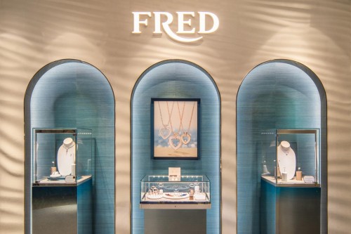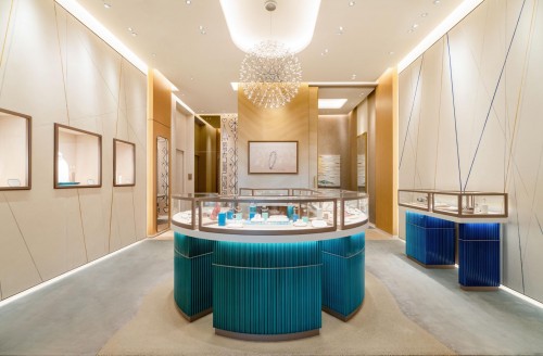 FRED斐登深圳湾万象城精品店、深圳万象城Pop-up快闪店采用焕然一新的设计理念,尽显南法蔚蓝海岸风情。店铺整体呈蔚蓝与粉金色调,搭配地面沙色大理石与玫瑰金色调,以明媚柔美的光线打造惬意的优美空间。