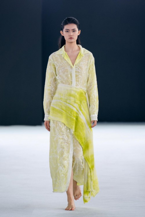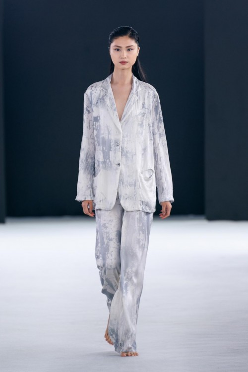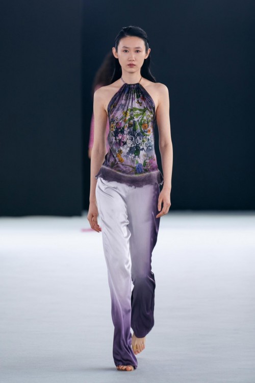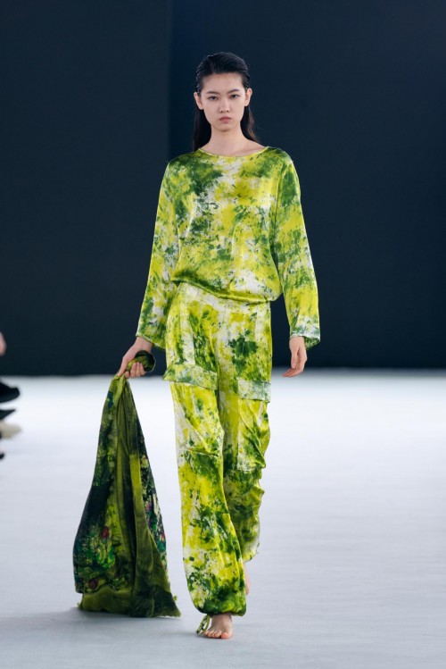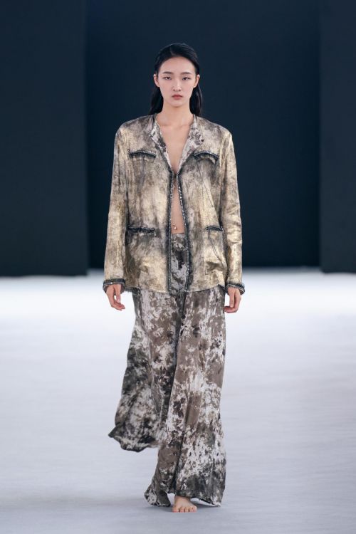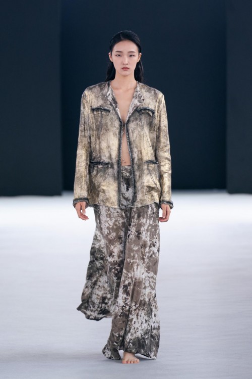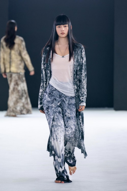 本季,Avant Toi也出现了全新的的非凡工艺,以创造花园中的缥缈诗意。新系列中的“拉丝效果”,是指用画笔手工绘制,在和服风格外套、网状狩猎夹克和许多其他特殊服装,创造出抽象的印花晕染效果。抽象诗意的拉丝工艺与更具象的、带有维多利亚风格的花卉图案、蝴蝶刺绣和热气球印花形成鲜明对比,塑造出张弛有度的时尚态度。