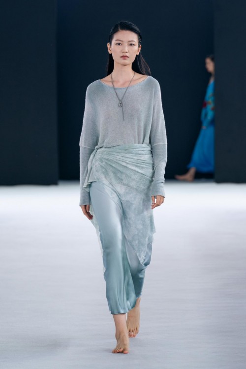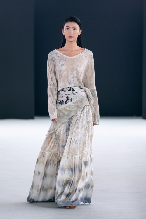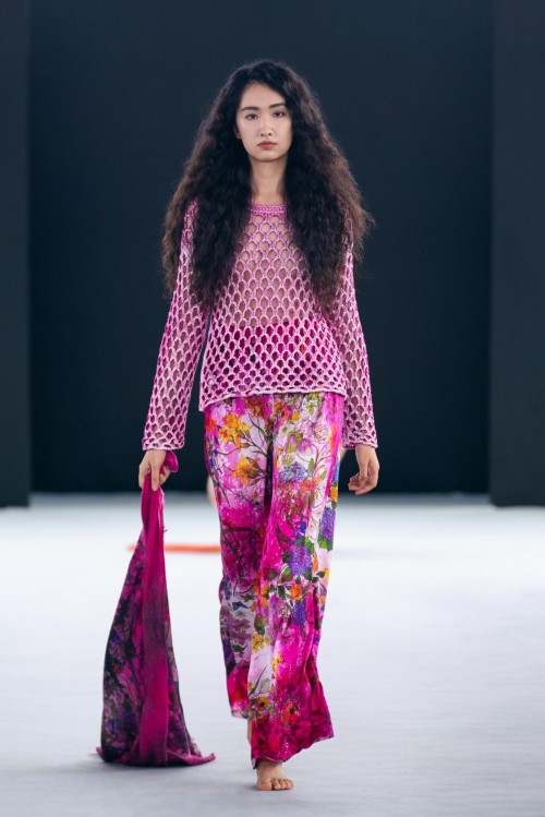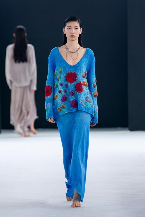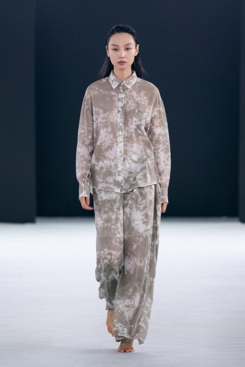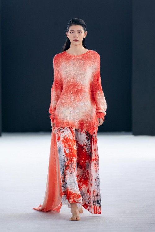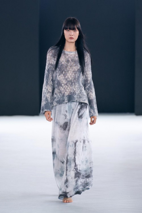 手绘、迷彩等与色点的多种来自Avant Toi的标志性色彩在针织衫、纱质羊绒、丝绸套头衫和蕾丝毛衣有所体现。大理石纹效果让人想起被刻上岁月痕迹的墙壁,蜡染图案或饰钉和来自色彩晕染塑造的光影效果都为整体造型塑造出柔和光感,犹如身处午后的英式花园,让人流连忘返。