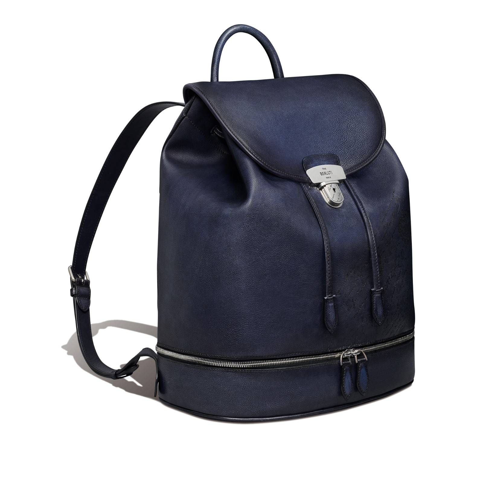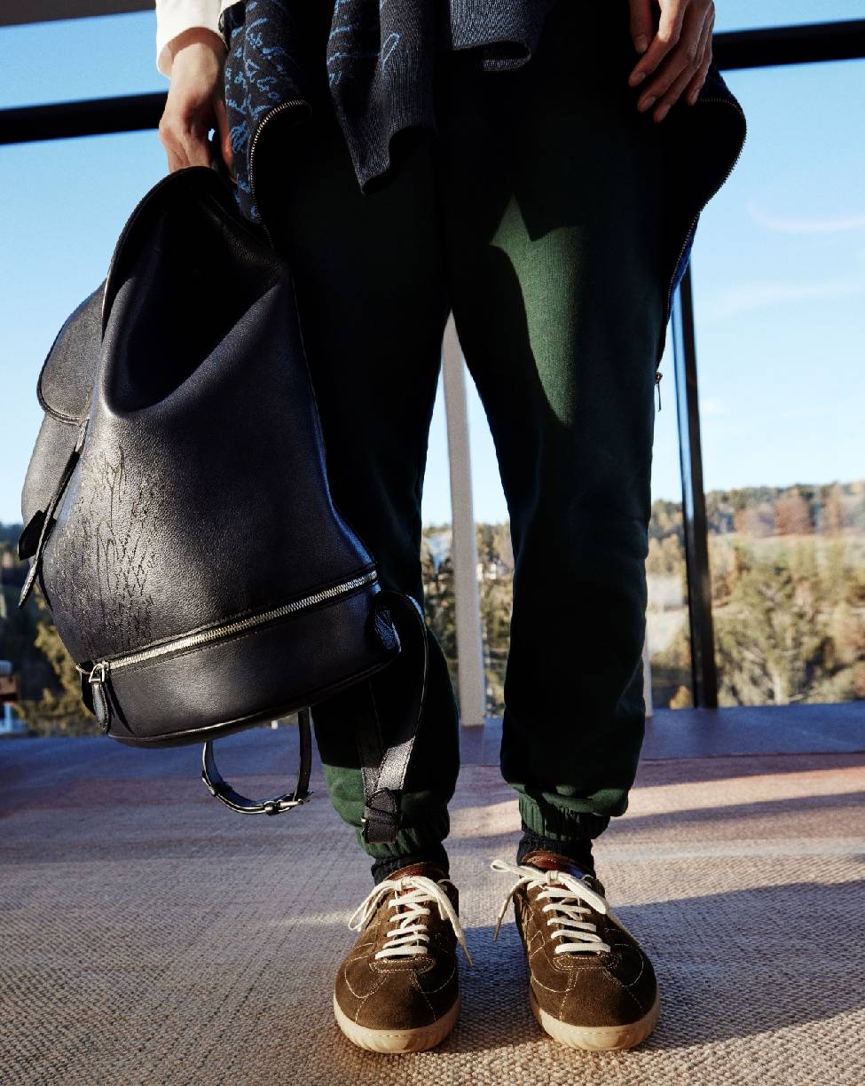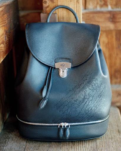 Postino PM邮差包比Postino邮差包的尺寸略小,包面上饰有复古银色锁扣,并配钥匙。双隔层设计,可以轻松容纳一台笔记本电脑。Escape 双肩背包亦是如此,这是一款全新翻盖背包,致敬Beluti精湛的制鞋匠艺,包袋的底部增加了鞋履隔层设计。两款包袋简洁实用,适于出行,完美演绎这一季的设计理念。