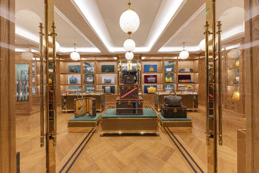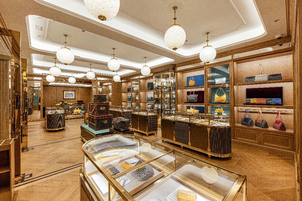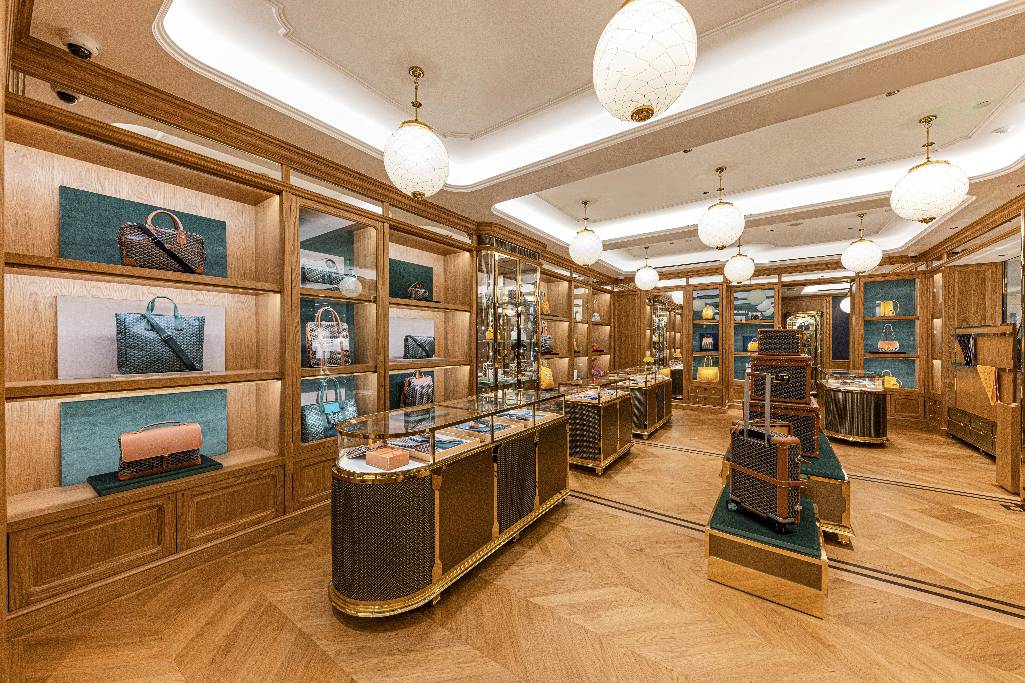 翻新后的店内设有特别订货区和专属的 VIC 沙龙,为您提供了一个独特的环境,让您可以在这里探索 Goyard 世界的方方面面:独一无二的手绘艺术、超前技艺的旅行箱和行李箱、标志性的包袋和小皮具,更不用说令人难以抗拒的爱宠系列(Chic du Chien)。