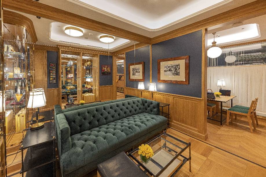 地板整体使用白橡木镶嵌出Y字图案,包括一个为北京国贸店铺专门设计的中央镶嵌图案,其灵感来自法国装饰艺术运动时期的存稿。除此之外, 更精选了当代和复古风格家具,包括橡木和黑色漆光的特别订制书桌、绿色长毛天鹅绒沙发和法国设计师雅克·阿德内特(Jacques Adnet) 风格的茶几等重要家具,则为店内增添了浓厚的法式艺术气息。