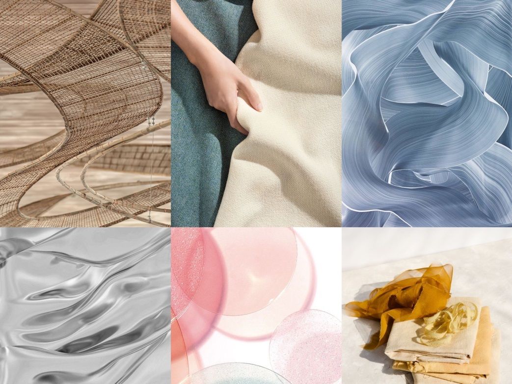 色彩方面,嫩芽黄,沙土棕,陨石灰等大地色色系,回应今年源于自然重返自然的主题,在混沌中寻找光芒,霞光粉,水蓝点缀,让整体色调活跃,注入生命力。