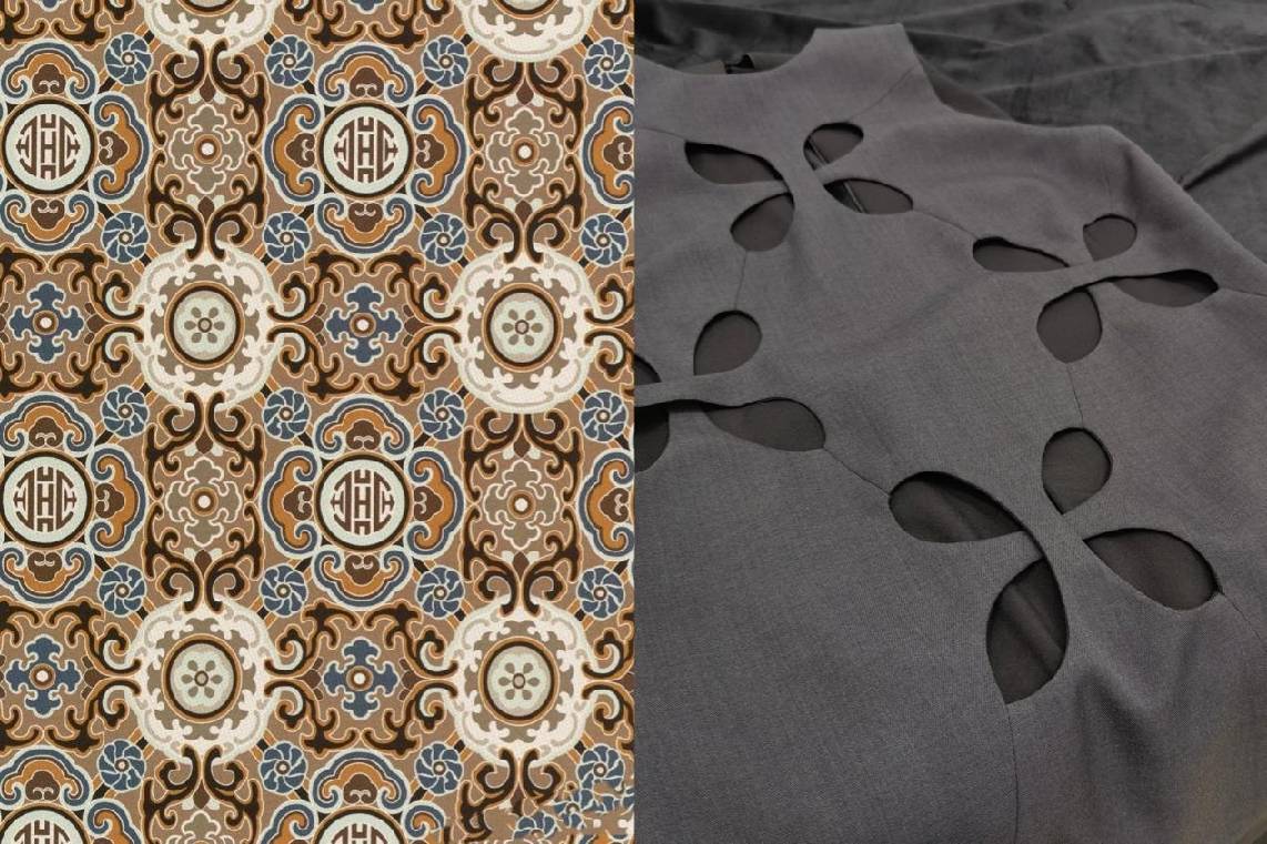 面料改造方面,图案与面料的融合交错,以中式传统的团纹散点排列为契机,将几何形融入其中,秩序感为整个系列增加了东方神秘感。