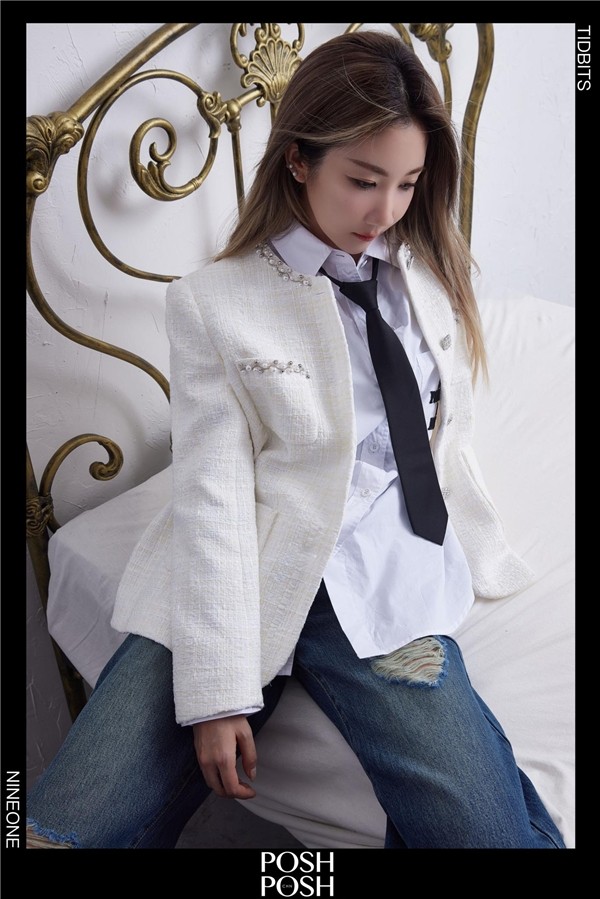 不同层次的白色,探索着不同内心世界。ochirly欧时力纯白香风外套利落加身,混搭飘逸领带。复古与现代融合,帅气和柔美交织,皆为乃万的风格注解,映衬出乃万纯粹、自由多样的音乐世界。