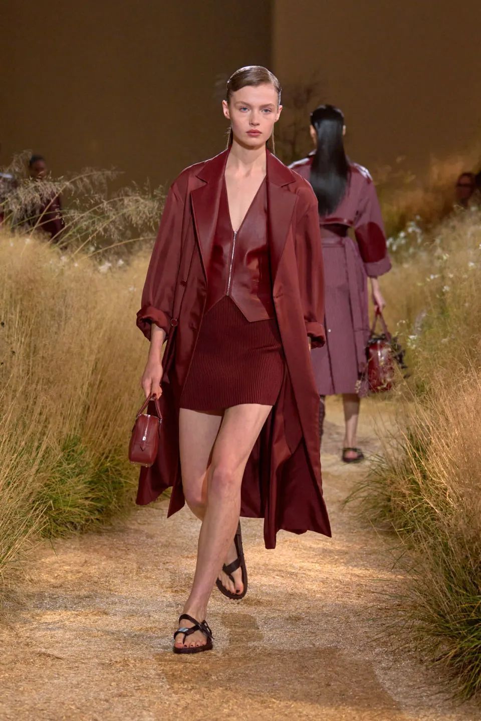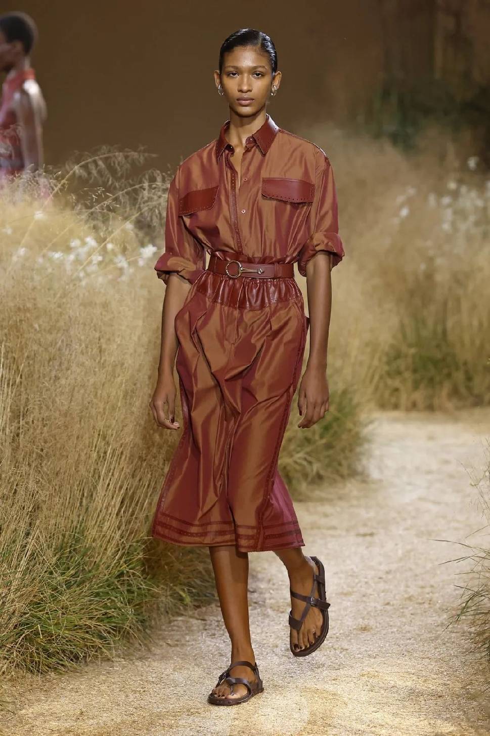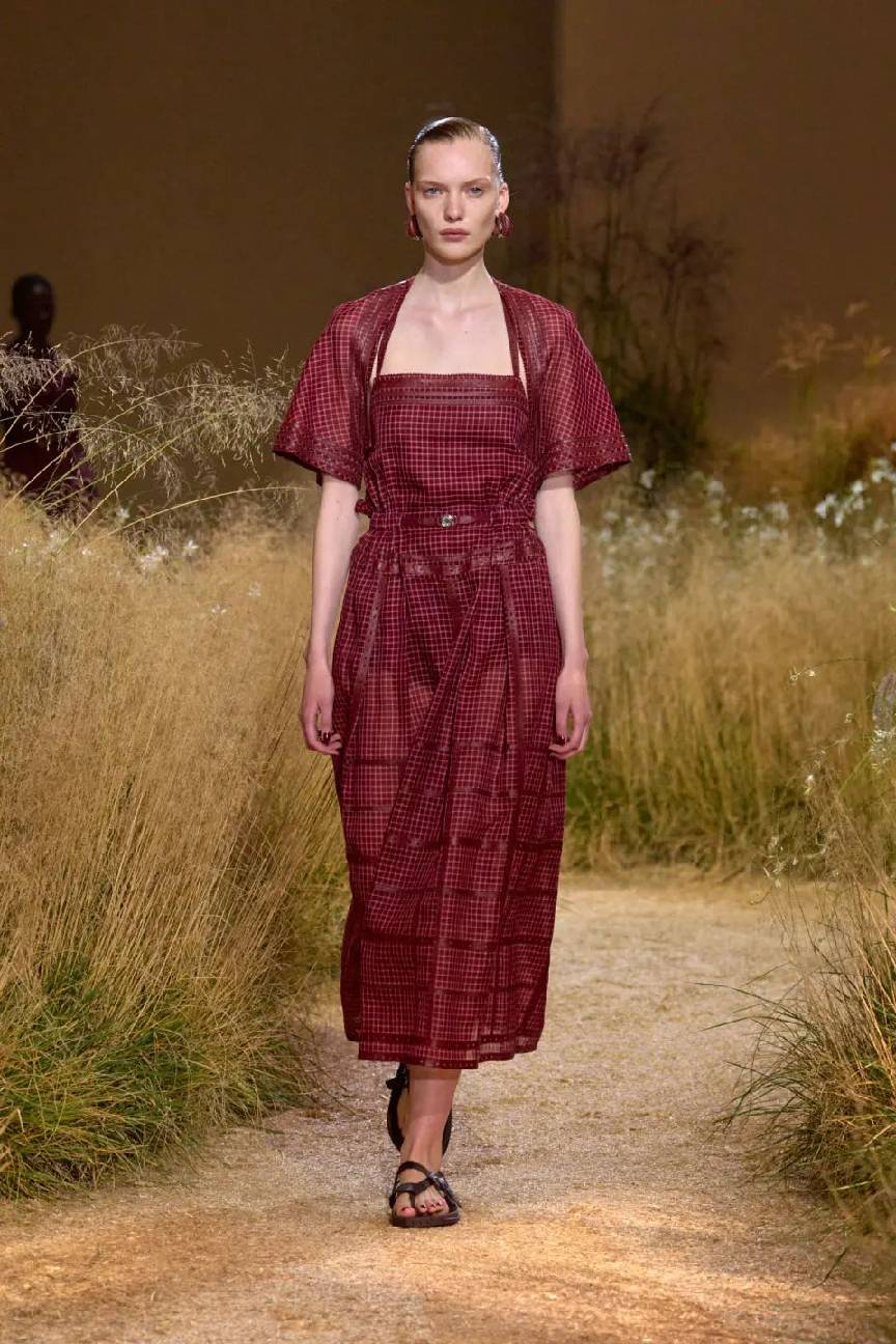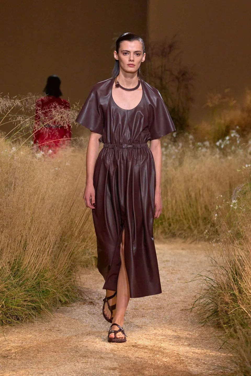 呼吸着田间自由的风,感受盈盈的春光倾撒在草叶尖,聆听大自然在春天的呓语,追寻重拾自我的本心和初意,仔细听,婉转悠扬的吟诵慢慢传来,这是HERMÈS在2024春夏女装秀场上带给春天的一首田园抒情诗。HERMÈS创意总监Nadège Vanhee-Cybulski在本季用轻盈、开放、自由、笃定四个词语来描绘春天的时装,将织物与色度、弧线与色彩的极致魅力融合进欢愉自然的面料与设计之中,大胆挑战着装组合的观感与法则,不仅将服装视作人的第二层肌肤,也借助它们柔软细腻、展示身形的个性为人们带来全新的穿着体验。细腻柔软的皮革单品是 Hermès 秀场上最值得期待的部分,本季也不例外。皮革光滑细腻的调性好像能让所有人预见极度舒适的穿着感受,质感上乘的面料触感,流畅立体的剪裁与廓形,再结合酒红色、橄榄棕、灰白色、巧克力色等从自然界撷取的色调和配色灵感,不仅造就了低调沉稳、奢华有度的皮革大衣、马甲,带给人温暖如春的视觉体验,也让皮革连衣裙在摇曳的身姿中诠释出复古摩登的味道。用作点缀和搭配材料的皮革也同样发挥出了淋漓尽致的美感,作为腰间装饰与Tattersall格纹印花套装进行搭配,完全成就了一场知性优雅与复古个性相配合的完美演出;与针织和真丝上装进行协调,则为我们呈现出别开生面的混搭和碰撞,带给皮革面料一场展示自我的全新变革。罗纹的肌理和立体感格外突出,本身柔软亲肤的面料质感也与身体达成极高的贴合度,加上各种版型和剪裁线条的变化,挂脖短吊带浪漫随性、刻画出春夏季节的明媚质感,工期背心颇具中性风格,配合沉稳经典的色系是怎么搭配都难以出错的选择,Polo领拉链针织衫和背心则赋予了罗纹针织面料更加休闲随性的表达,仔细观察也会发现,罗纹针织背心的底部都用了皮质面料做搭配,不仅增添了层次感和丰富度,也将简约大气的风格之中注入几分休闲的味道。在自然田园里迈开随性步伐的HERMÈS,怎么能缺少对慵懒田园风格的极力诠释?皮质吊带和连衣裙做了菱形格纹的镂空,让原本些许厚重的面料变得更加的轻盈和自由的视觉效果,充满田园自然风情的同时也与春夏季节的气息完美适配;另一边,秀场上的棉麻面料也是营造慵懒感和田园风的不二答案,棉麻质感舒适透气,自带的肌理感搭配细小的格纹图案,连衣裙、半裙、套装的多种组合,倾力让春日田园气息丰盈了整个秀场,关注细节,在棉麻半裙和裤脚上摇曳起舞的是英格兰传统印花,也是把田园感和浪漫风浓度提高的设计巧思。还有薄纱质地的波浪纹连衣裙,干净优雅的纯白色,轻盈曼妙的身材若隐若现,慵懒度假风格之中又极具浪漫主义色彩。不难发现,整个秀场上除了有十足的田园气息和自然风情,那种不张扬也不内敛的奢华就像空气一般,裹挟着秀场的一草一木,却让人觉得它生来就是融于这里的一部分。HERMÈS利用质感极佳的羊绒和真丝面料打造而成的大衣和外套,就是静奢之感的最佳展现。羊绒温暖而有厚度,真丝顺滑飘逸,一种重工与飘逸相辅相成的效果、一种与运动装混搭而成的意趣格调,随性天成,个性由心,带给我们不落俗套的匠心工艺和突破常规的大胆搭配,让经典和创造力共襄盛举。作为爱马仕的经典之作的Birkin手袋,一直以来都是众多女性的梦想之物。而在这一季的设计中,大地棕色的Birkin包袋更是以全新的姿态亮相,让人眼前一亮。它的出现,仿佛为整个秀场增添了一抹浓郁的自然气息,让人不禁为之倾倒。这一次,设计师们更是将它的尺寸缩小,打造出了更为精致可爱的mini款。Panier d’été 以全新的面貌亮相,采用更为轻便的材质,搭配明亮的色彩和精美的走线,营造出一种轻松愉悦的氛围,仿佛带领人们重回美好的夏日时光。Pochette d’été设计小巧玲珑,酒红色的配色更是显得高贵典雅。无论是出席正式场合还是日常出行,它都能成为你的最佳伴侣,让你在人群中脱颖而出。除了各种精美的包袋之外,本季的爱马仕还为我们带来了一款平底绑带凉鞋。无论是搭配裙装还是裤装,都能展现出不同的魅力。回看这一季的HERMÈS,自然春意疯狂生长,我们也在生长的间隙里,看到轻盈充沛、自由无拘的时装力量。