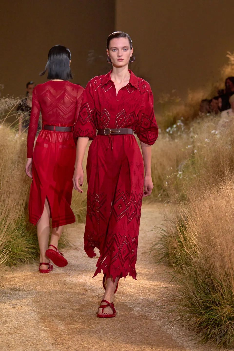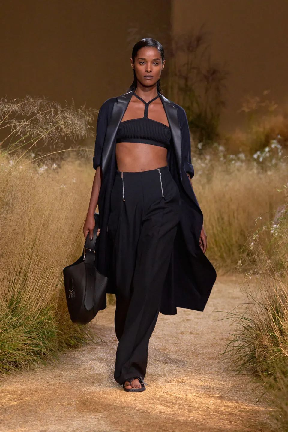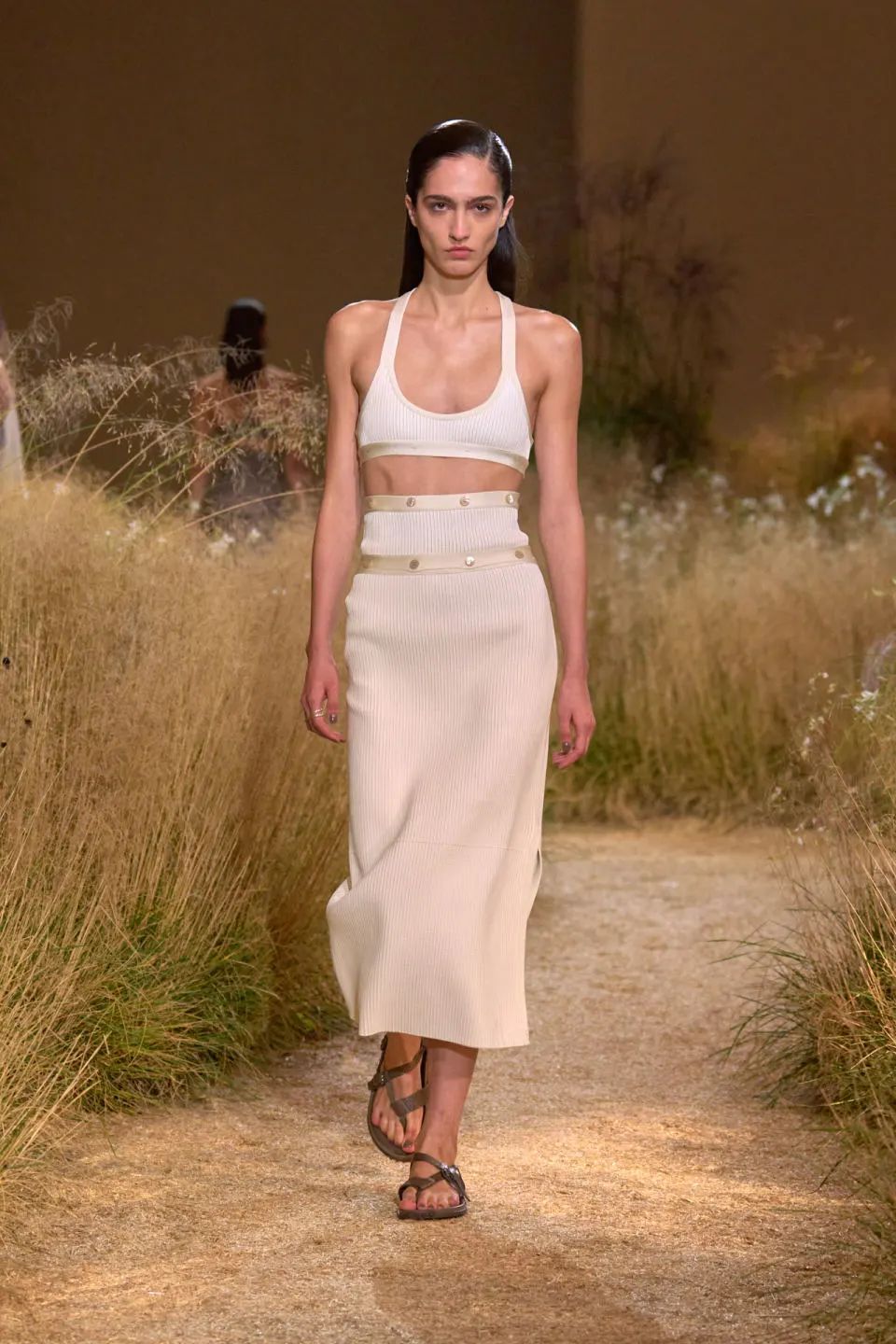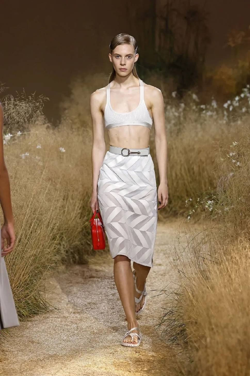 呼吸着田间自由的风,感受盈盈的春光倾撒在草叶尖,聆听大自然在春天的呓语,追寻重拾自我的本心和初意,仔细听,婉转悠扬的吟诵慢慢传来,这是HERMÈS在2024春夏女装秀场上带给春天的一首田园抒情诗。HERMÈS创意总监Nadège Vanhee-Cybulski在本季用轻盈、开放、自由、笃定四个词语来描绘春天的时装,将织物与色度、弧线与色彩的极致魅力融合进欢愉自然的面料与设计之中,大胆挑战着装组合的观感与法则,不仅将服装视作人的第二层肌肤,也借助它们柔软细腻、展示身形的个性为人们带来全新的穿着体验。细腻柔软的皮革单品是 Hermès 秀场上最值得期待的部分,本季也不例外。皮革光滑细腻的调性好像能让所有人预见极度舒适的穿着感受,质感上乘的面料触感,流畅立体的剪裁与廓形,再结合酒红色、橄榄棕、灰白色、巧克力色等从自然界撷取的色调和配色灵感,不仅造就了低调沉稳、奢华有度的皮革大衣、马甲,带给人温暖如春的视觉体验,也让皮革连衣裙在摇曳的身姿中诠释出复古摩登的味道。用作点缀和搭配材料的皮革也同样发挥出了淋漓尽致的美感,作为腰间装饰与Tattersall格纹印花套装进行搭配,完全成就了一场知性优雅与复古个性相配合的完美演出;与针织和真丝上装进行协调,则为我们呈现出别开生面的混搭和碰撞,带给皮革面料一场展示自我的全新变革。罗纹的肌理和立体感格外突出,本身柔软亲肤的面料质感也与身体达成极高的贴合度,加上各种版型和剪裁线条的变化,挂脖短吊带浪漫随性、刻画出春夏季节的明媚质感,工期背心颇具中性风格,配合沉稳经典的色系是怎么搭配都难以出错的选择,Polo领拉链针织衫和背心则赋予了罗纹针织面料更加休闲随性的表达,仔细观察也会发现,罗纹针织背心的底部都用了皮质面料做搭配,不仅增添了层次感和丰富度,也将简约大气的风格之中注入几分休闲的味道。在自然田园里迈开随性步伐的HERMÈS,怎么能缺少对慵懒田园风格的极力诠释?皮质吊带和连衣裙做了菱形格纹的镂空,让原本些许厚重的面料变得更加的轻盈和自由的视觉效果,充满田园自然风情的同时也与春夏季节的气息完美适配;另一边,秀场上的棉麻面料也是营造慵懒感和田园风的不二答案,棉麻质感舒适透气,自带的肌理感搭配细小的格纹图案,连衣裙、半裙、套装的多种组合,倾力让春日田园气息丰盈了整个秀场,关注细节,在棉麻半裙和裤脚上摇曳起舞的是英格兰传统印花,也是把田园感和浪漫风浓度提高的设计巧思。还有薄纱质地的波浪纹连衣裙,干净优雅的纯白色,轻盈曼妙的身材若隐若现,慵懒度假风格之中又极具浪漫主义色彩。不难发现,整个秀场上除了有十足的田园气息和自然风情,那种不张扬也不内敛的奢华就像空气一般,裹挟着秀场的一草一木,却让人觉得它生来就是融于这里的一部分。HERMÈS利用质感极佳的羊绒和真丝面料打造而成的大衣和外套,就是静奢之感的最佳展现。羊绒温暖而有厚度,真丝顺滑飘逸,一种重工与飘逸相辅相成的效果、一种与运动装混搭而成的意趣格调,随性天成,个性由心,带给我们不落俗套的匠心工艺和突破常规的大胆搭配,让经典和创造力共襄盛举。作为爱马仕的经典之作的Birkin手袋,一直以来都是众多女性的梦想之物。而在这一季的设计中,大地棕色的Birkin包袋更是以全新的姿态亮相,让人眼前一亮。它的出现,仿佛为整个秀场增添了一抹浓郁的自然气息,让人不禁为之倾倒。这一次,设计师们更是将它的尺寸缩小,打造出了更为精致可爱的mini款。Panier d’été 以全新的面貌亮相,采用更为轻便的材质,搭配明亮的色彩和精美的走线,营造出一种轻松愉悦的氛围,仿佛带领人们重回美好的夏日时光。Pochette d’été设计小巧玲珑,酒红色的配色更是显得高贵典雅。无论是出席正式场合还是日常出行,它都能成为你的最佳伴侣,让你在人群中脱颖而出。除了各种精美的包袋之外,本季的爱马仕还为我们带来了一款平底绑带凉鞋。无论是搭配裙装还是裤装,都能展现出不同的魅力。回看这一季的HERMÈS,自然春意疯狂生长,我们也在生长的间隙里,看到轻盈充沛、自由无拘的时装力量。