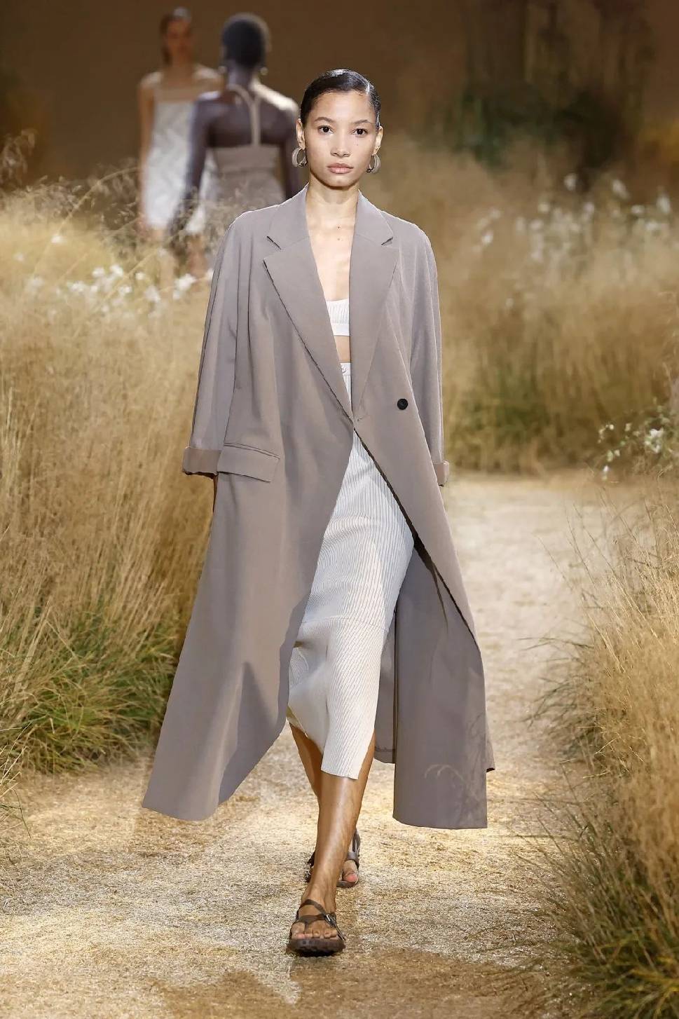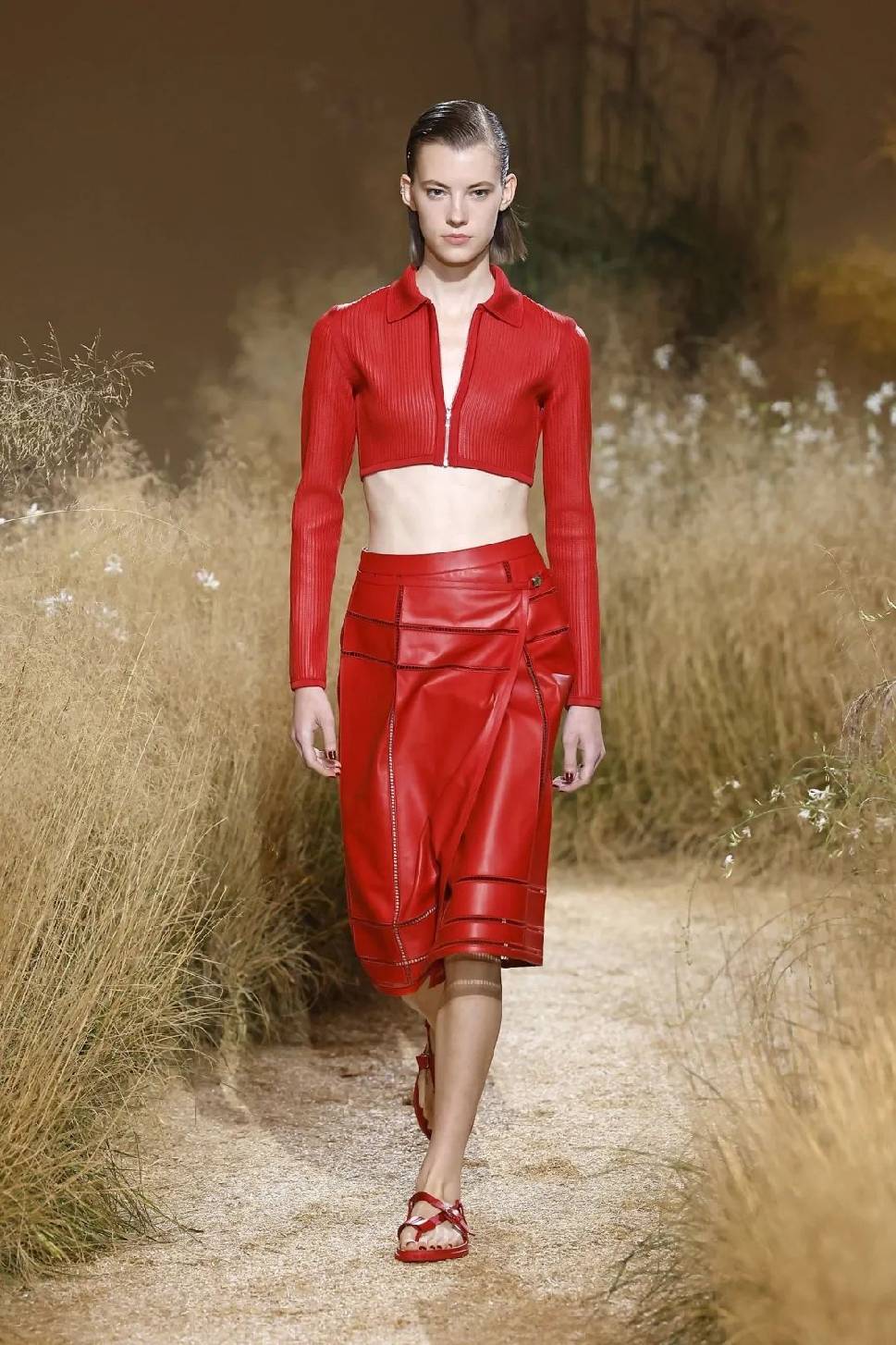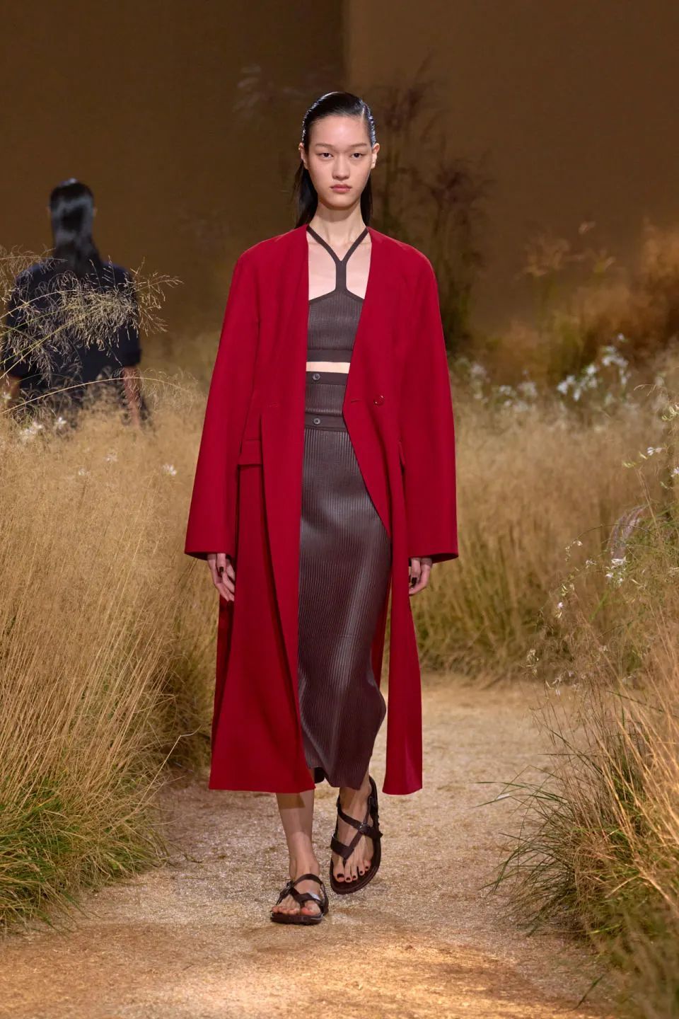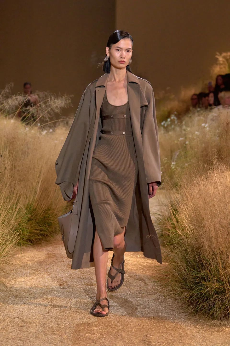 呼吸着田间自由的风,感受盈盈的春光倾撒在草叶尖,聆听大自然在春天的呓语,追寻重拾自我的本心和初意,仔细听,婉转悠扬的吟诵慢慢传来,这是HERMÈS在2024春夏女装秀场上带给春天的一首田园抒情诗。HERMÈS创意总监Nadège Vanhee-Cybulski在本季用轻盈、开放、自由、笃定四个词语来描绘春天的时装,将织物与色度、弧线与色彩的极致魅力融合进欢愉自然的面料与设计之中,大胆挑战着装组合的观感与法则,不仅将服装视作人的第二层肌肤,也借助它们柔软细腻、展示身形的个性为人们带来全新的穿着体验。细腻柔软的皮革单品是 Hermès 秀场上最值得期待的部分,本季也不例外。皮革光滑细腻的调性好像能让所有人预见极度舒适的穿着感受,质感上乘的面料触感,流畅立体的剪裁与廓形,再结合酒红色、橄榄棕、灰白色、巧克力色等从自然界撷取的色调和配色灵感,不仅造就了低调沉稳、奢华有度的皮革大衣、马甲,带给人温暖如春的视觉体验,也让皮革连衣裙在摇曳的身姿中诠释出复古摩登的味道。用作点缀和搭配材料的皮革也同样发挥出了淋漓尽致的美感,作为腰间装饰与Tattersall格纹印花套装进行搭配,完全成就了一场知性优雅与复古个性相配合的完美演出;与针织和真丝上装进行协调,则为我们呈现出别开生面的混搭和碰撞,带给皮革面料一场展示自我的全新变革。罗纹的肌理和立体感格外突出,本身柔软亲肤的面料质感也与身体达成极高的贴合度,加上各种版型和剪裁线条的变化,挂脖短吊带浪漫随性、刻画出春夏季节的明媚质感,工期背心颇具中性风格,配合沉稳经典的色系是怎么搭配都难以出错的选择,Polo领拉链针织衫和背心则赋予了罗纹针织面料更加休闲随性的表达,仔细观察也会发现,罗纹针织背心的底部都用了皮质面料做搭配,不仅增添了层次感和丰富度,也将简约大气的风格之中注入几分休闲的味道。在自然田园里迈开随性步伐的HERMÈS,怎么能缺少对慵懒田园风格的极力诠释?皮质吊带和连衣裙做了菱形格纹的镂空,让原本些许厚重的面料变得更加的轻盈和自由的视觉效果,充满田园自然风情的同时也与春夏季节的气息完美适配;另一边,秀场上的棉麻面料也是营造慵懒感和田园风的不二答案,棉麻质感舒适透气,自带的肌理感搭配细小的格纹图案,连衣裙、半裙、套装的多种组合,倾力让春日田园气息丰盈了整个秀场,关注细节,在棉麻半裙和裤脚上摇曳起舞的是英格兰传统印花,也是把田园感和浪漫风浓度提高的设计巧思。还有薄纱质地的波浪纹连衣裙,干净优雅的纯白色,轻盈曼妙的身材若隐若现,慵懒度假风格之中又极具浪漫主义色彩。不难发现,整个秀场上除了有十足的田园气息和自然风情,那种不张扬也不内敛的奢华就像空气一般,裹挟着秀场的一草一木,却让人觉得它生来就是融于这里的一部分。HERMÈS利用质感极佳的羊绒和真丝面料打造而成的大衣和外套,就是静奢之感的最佳展现。羊绒温暖而有厚度,真丝顺滑飘逸,一种重工与飘逸相辅相成的效果、一种与运动装混搭而成的意趣格调,随性天成,个性由心,带给我们不落俗套的匠心工艺和突破常规的大胆搭配,让经典和创造力共襄盛举。作为爱马仕的经典之作的Birkin手袋,一直以来都是众多女性的梦想之物。而在这一季的设计中,大地棕色的Birkin包袋更是以全新的姿态亮相,让人眼前一亮。它的出现,仿佛为整个秀场增添了一抹浓郁的自然气息,让人不禁为之倾倒。这一次,设计师们更是将它的尺寸缩小,打造出了更为精致可爱的mini款。Panier d’été 以全新的面貌亮相,采用更为轻便的材质,搭配明亮的色彩和精美的走线,营造出一种轻松愉悦的氛围,仿佛带领人们重回美好的夏日时光。Pochette d’été设计小巧玲珑,酒红色的配色更是显得高贵典雅。无论是出席正式场合还是日常出行,它都能成为你的最佳伴侣,让你在人群中脱颖而出。除了各种精美的包袋之外,本季的爱马仕还为我们带来了一款平底绑带凉鞋。无论是搭配裙装还是裤装,都能展现出不同的魅力。回看这一季的HERMÈS,自然春意疯狂生长,我们也在生长的间隙里,看到轻盈充沛、自由无拘的时装力量。