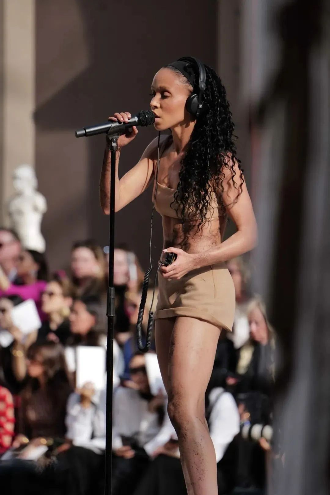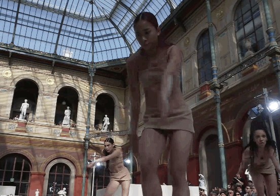 除了带来全新创作的曲目“unearth her”之外,还在现场与五位肌肉线条如诸神般美丽的女性舞者,现场以声音艺术的方式进行收音,和沙石、地板发生互动,时而激烈、时而温柔,这也是她数月以来和品牌创意总监Pierpaolo Piccioli的沟通结果 —— 如何去传达品牌强调的原生女性力量和气质,在最为原生态的舞台上,去讨论“何为当代女性”的宏大议题。