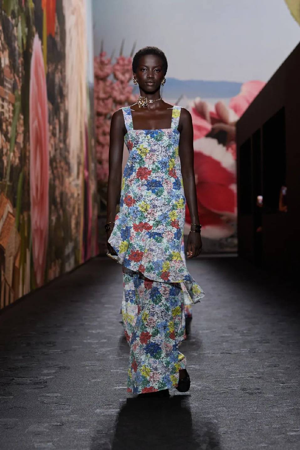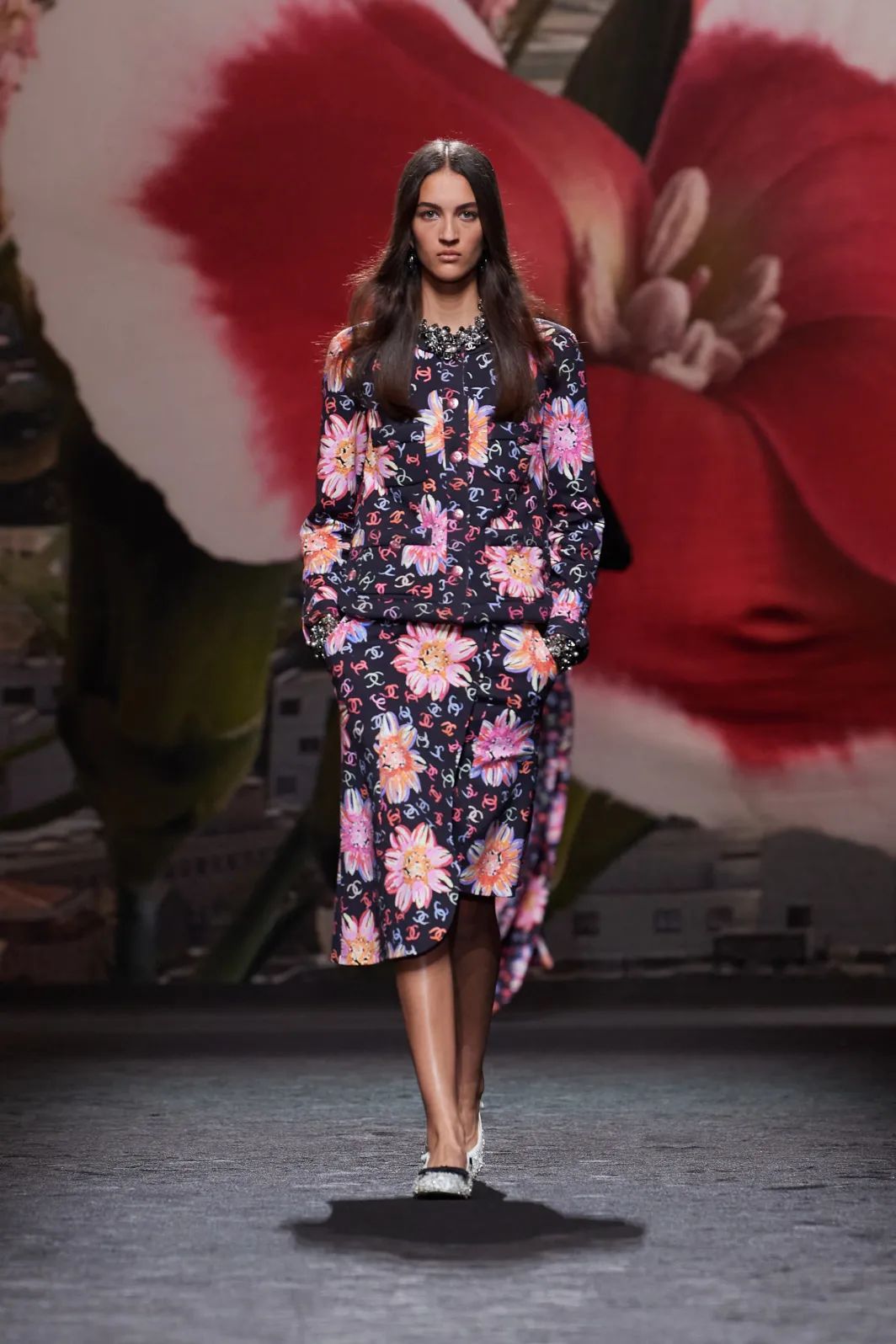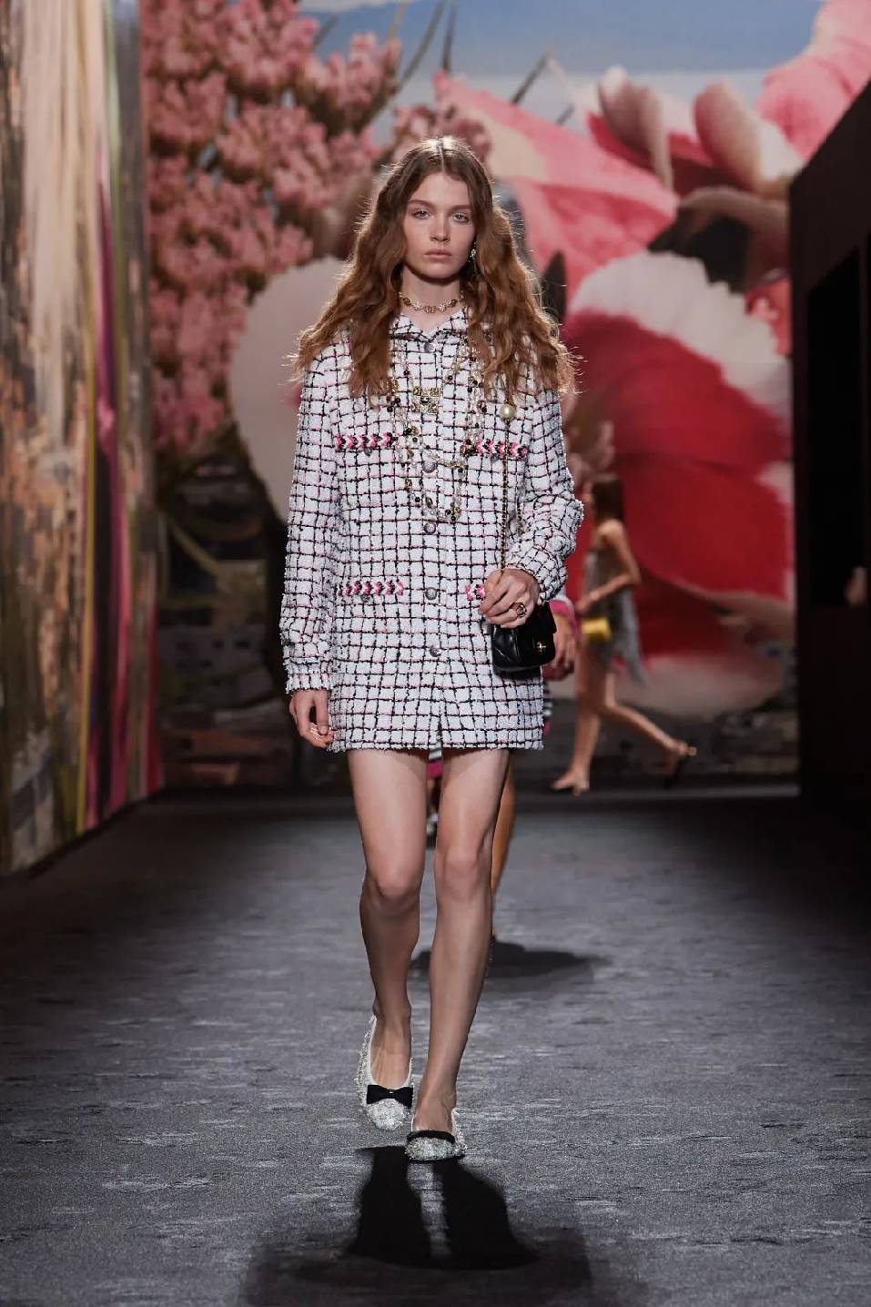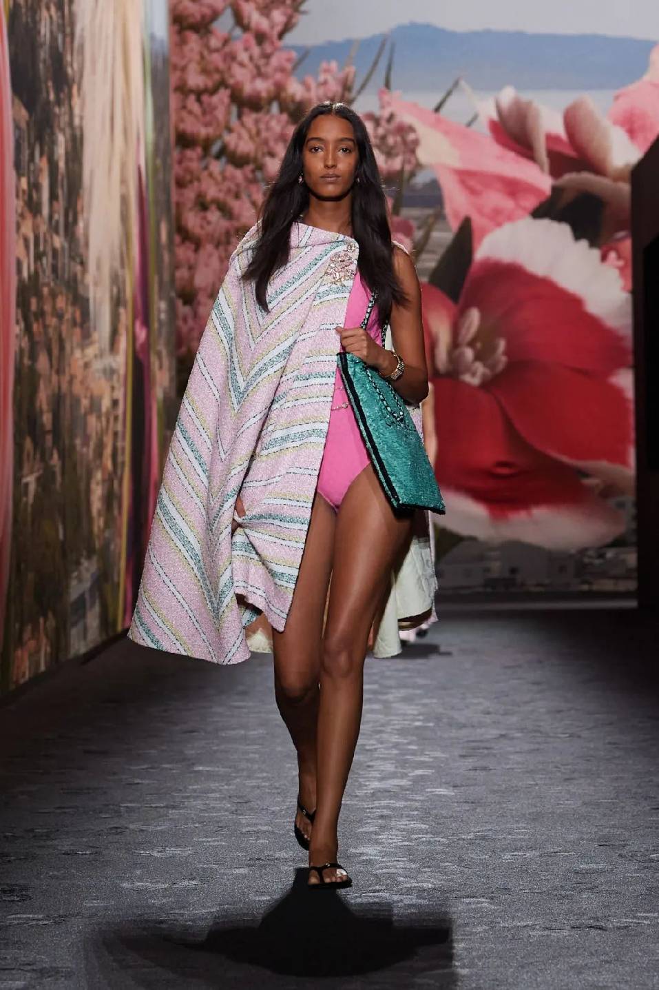 今年是诺阿耶别墅花园建造的100周年,Virginie Viard以它为灵感。在这里,让与山海为邻的花园别墅诺阿耶讲述立体几何美学,让Virginie Viard为你缓缓道来有关自由、松弛、随性和灵动的故事。“精致与闲适,贯穿系列的斜纹软呢,运动服与蕾丝:我试着以最酷的方式将两种截然相反的风格融合在一起。在诺阿耶别墅花园与泳池的独特氛围下,非常应景。”维吉妮·维娅说道。斜纹软呢外套和礼服裙是CHANEL不变的旋律,软呢具有柔软细腻的质感,融合彩色、粉色、黑色等等魅力十足的色调,并在旖丽色彩中再次对撞大小格纹的真正魅力,带给人永恒的摩登体验。而重要的是,此次的成衣摆脱肩章和内衬的束缚,用更加自由、无拘的轮廓诠释极致慵懒的南法浪漫,随性洒脱的形象之中,也展露出更加蓬勃的生命力和强大气场。若说追求随性与自由是一场随着海浪出发的漫长徒步,那斜纹软呢与泳装的惊喜搭配,连衣裙一般自由舒适的开襟衫、轻盈灵动的褶裙,一定都是探险中最具吸引力的海岸。那种包裹身形的流畅线条、极致舒适的穿搭体验和打破法则的搭配组合,无一不散发着灵动自如的气息和随性自我的穿衣态度,触及人们心底对自由最热切的向往。当来自南法的别墅花园诺阿耶成为本季的灵感发源地,它的轮廓和户外空间就时刻点亮着时装的魅力与光芒。在Virginie Viard的眼里,以小见大是用时装诠释风格的独到手法,所以着眼于方格花园和下沉式花坛别样的立体主义风格,并将其浓缩进时装之中,并用几何图案来进行诠释,才造就了秀场之上,我们得以从迷人的时装遇见诺阿耶的惊艳。多样的色彩铺色之下,交错有致的线条、拼贴画般的格纹,不对称的设计,还有散落在条纹之间的圆点,化作玻璃彩窗的菱格,纷纷让立体学和几何图案的美感以具象的方式呈现在眼前,韵律感、节奏感如奔流的浪潮席卷而来,也完全不失立体建筑的恢弘大气和数字几何的逻辑趣味。当色彩斑斓的印花图案裙装走上T台,忽如优雅而浪漫的风萦绕在旁。但我们也许想象不到,这样浪漫的度假风情是由Neoprene高科技潜水面料塑造而成的,特殊高科技面料的轻盈透气拥簇着浪漫的格调,形成了质感与图案之间的奇妙联结,也造就了科技的超前感和设计创意性的共同呈现。CHANEL也赋予花卉图案丰富的廓形演绎,蕾丝连衣裙、裤装,都可以借由图案的魅力散发独一无二的惬意感、优雅感和度假风情。黑色渐渐成为主色调,占据秀场和视线的同时,我们看到轻盈飘逸的薄纱微微扬起,灵动非常。极具神秘感和魅惑力的乌干纱,被塑造成连衣裙、衬衫、衬裙和抹胸上衣,单独演绎颇有性感明媚的味道,轻薄的材质也带来了随意叠穿的可能和意外碰撞出的摩登视角。如何搭配完全随心随意,在注入自己的审美和喜好的同时,也刻画出对自由和灵动之感的深刻理解。CHANEL擅长设计有趣且精致的配饰,本季也不例外。花园花卉成为主角,那些金色的首饰,由Coco Chanel与Villa Noailles女主人Marie-Laure de Noailles的名字拼成,与双C logo交相辉映。既然是海滩,那么墨镜也是不可忽视的重点。与先锋派艺术家相交甚笃的玛丽-洛尔·德·诺阿耶与嘉柏丽尔·香奈儿,其标志性元素在饰以金色链条的黑色太阳眼镜上散发出强烈个性。在兼顾实用主义的当下,手袋的包容度和选择性也更为丰富。超大手袋称得上是户外度假的好搭档;小相机包则是Virginie Viard向Karl Lagerfeld摄影爱好的致敬,将成为无数女性的新宠;各式精致的小size手袋也层出不穷,营造轻松惬意的氛围感。经典玛丽珍也焕新,乖巧的鞋袢装饰+圆润光滑的鞋面,CHANEL的玛丽珍鞋把优雅的气质发挥到了极致,既还原了玛丽珍的少女感,又增添了法式浪漫。值得一提的是,充满街头韵味的人字拖,点缀着简约双C标识,更显轻松、恣意。本季秀场依旧众星云集,王一博、张子枫、Jennie......他们都用自己的look来诉说属于CHANEL的时尚态度。这一次,CHANEL从诺阿耶中重寻浪漫与优雅,也致敬自由和灵动,当然最想传递出的声音还是——请你轻松、惬意地做自己。