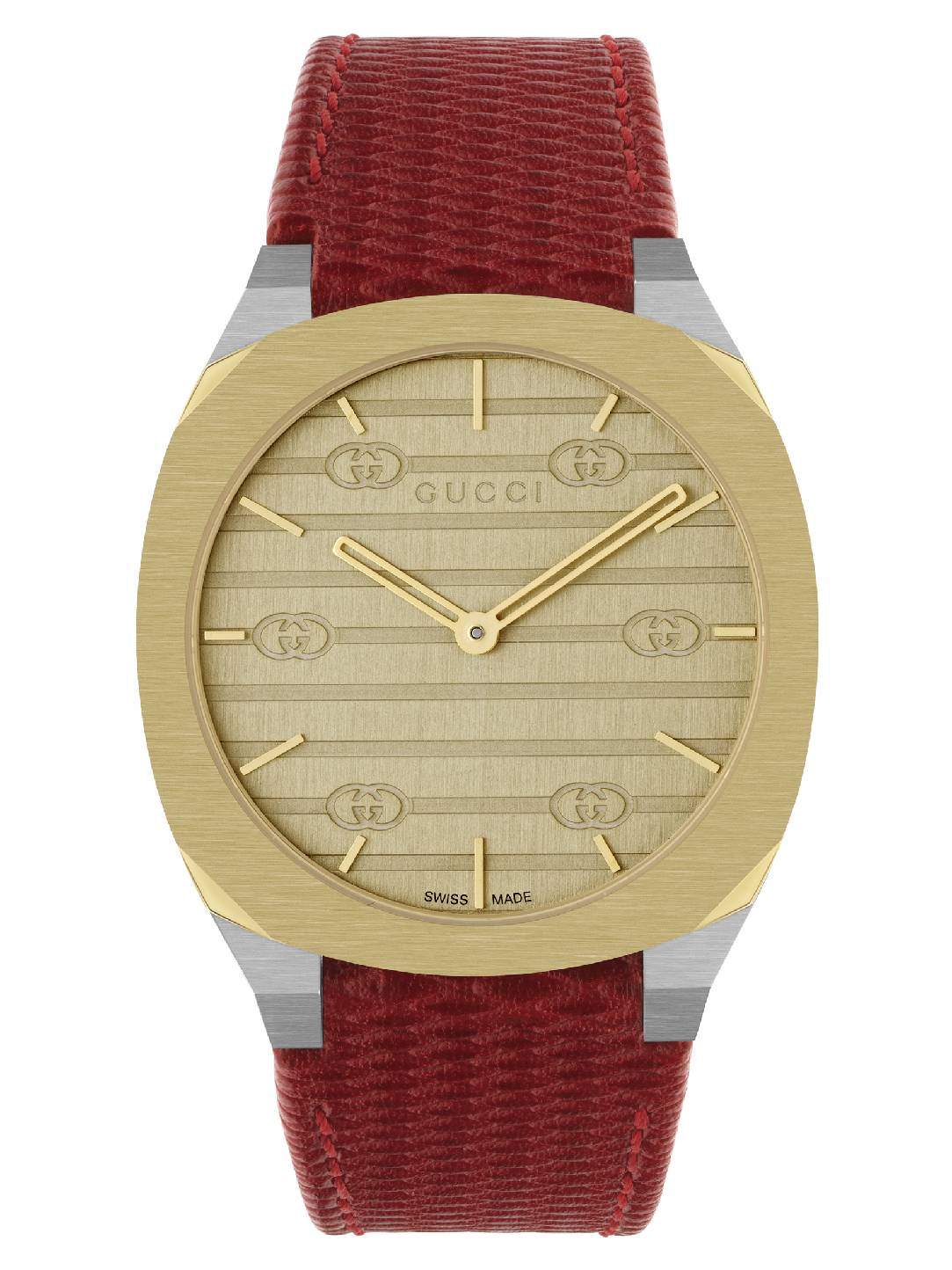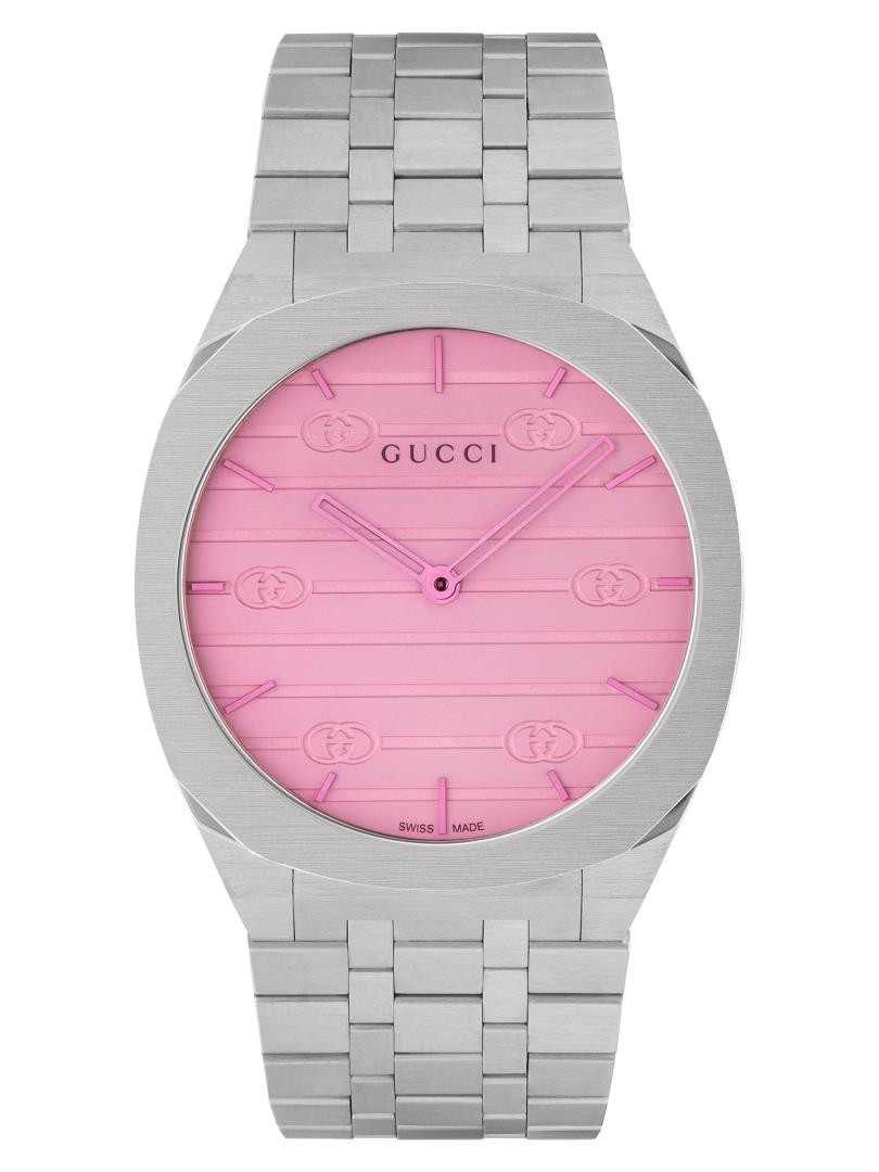 Gucci 25H系列腕表凭借纤薄表身设计,率先摆脱秋日的沉重感,释放轻盈魅力。彩色皮革表带为腕间注入活力风尚,与摩登金碰撞出复古质感;经典的银色精钢表链搭配粉色玻璃表盘,可以根据光线的变化呈现出不同色调,吸睛夺目。