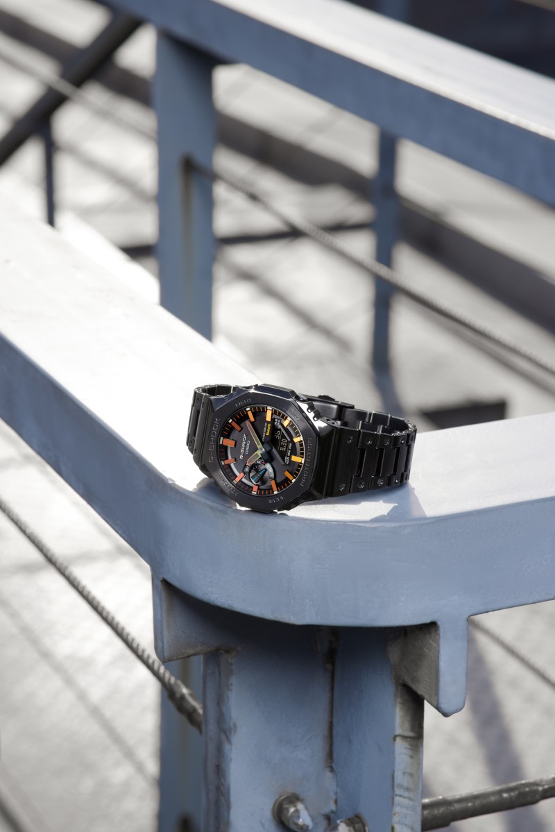 以酷感黑色为基底,表盘时标的红橙渐变映射GM-B2100BPC-1A的八角型格,辉映战胜时间的自由力量。