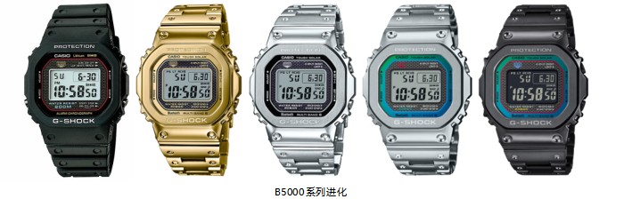 作为G-SHOCK的开山之作,DW-5000C的小方块设计为G-SHOCK奠定了制霸潮流的地位。此后B5000系列不断壮大,并实现了震撼腕表界的金属化,带来了重燃初代情怀的GMW-B5000D-1和致敬黄金年代的GMW-B5000GD-9,每一款B5000新作的诞生,无疑都是经典的再次革新。