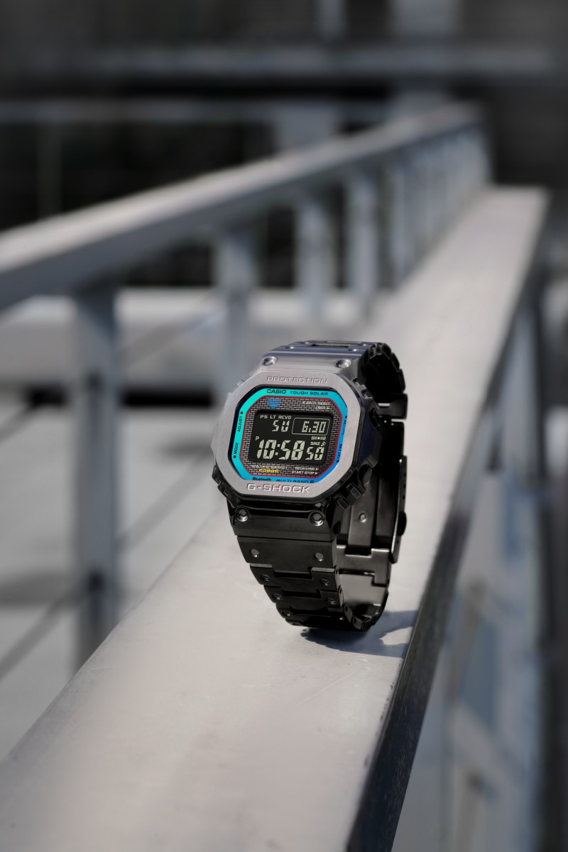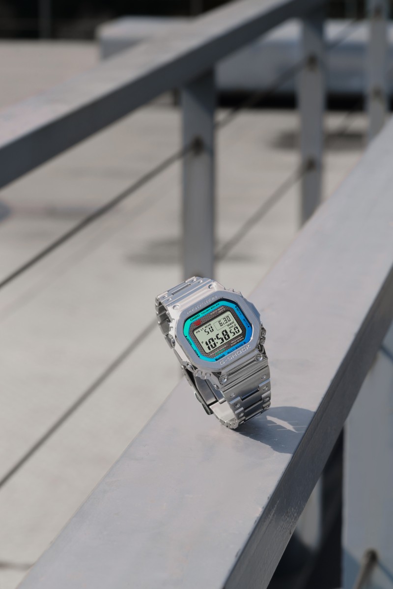 金属材质的银色光泽尽显GMW-B5000PC-1的坚毅美学,蓝绿渐变将活力注入表盘,展现方寸之间的时尚魅力。