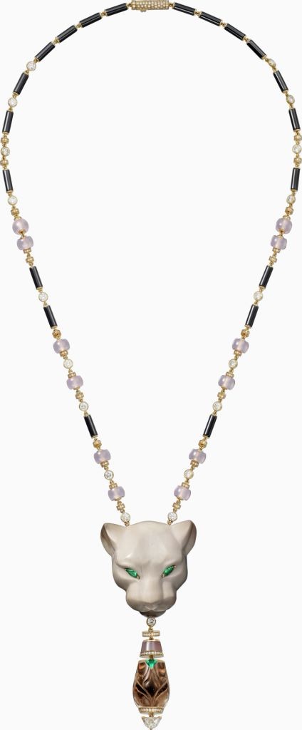 自1914年以来,猎豹便成为卡地亚动物王国中当之无愧的主角。此次,卡地亚宝石雕刻工匠将芦木化石原石雕刻为栩栩如生的豹首,炯炯目光“注视”着一枚雕刻精致花卉图案的摩根石吊坠。这种植物化石的诞生可上溯至下石炭纪时期,在珠宝作品中实属罕见。管状缟玛瑙、粉色玉髓和镶嵌于黄金之上的钻石交替排列,使链节的排布格外醒目。