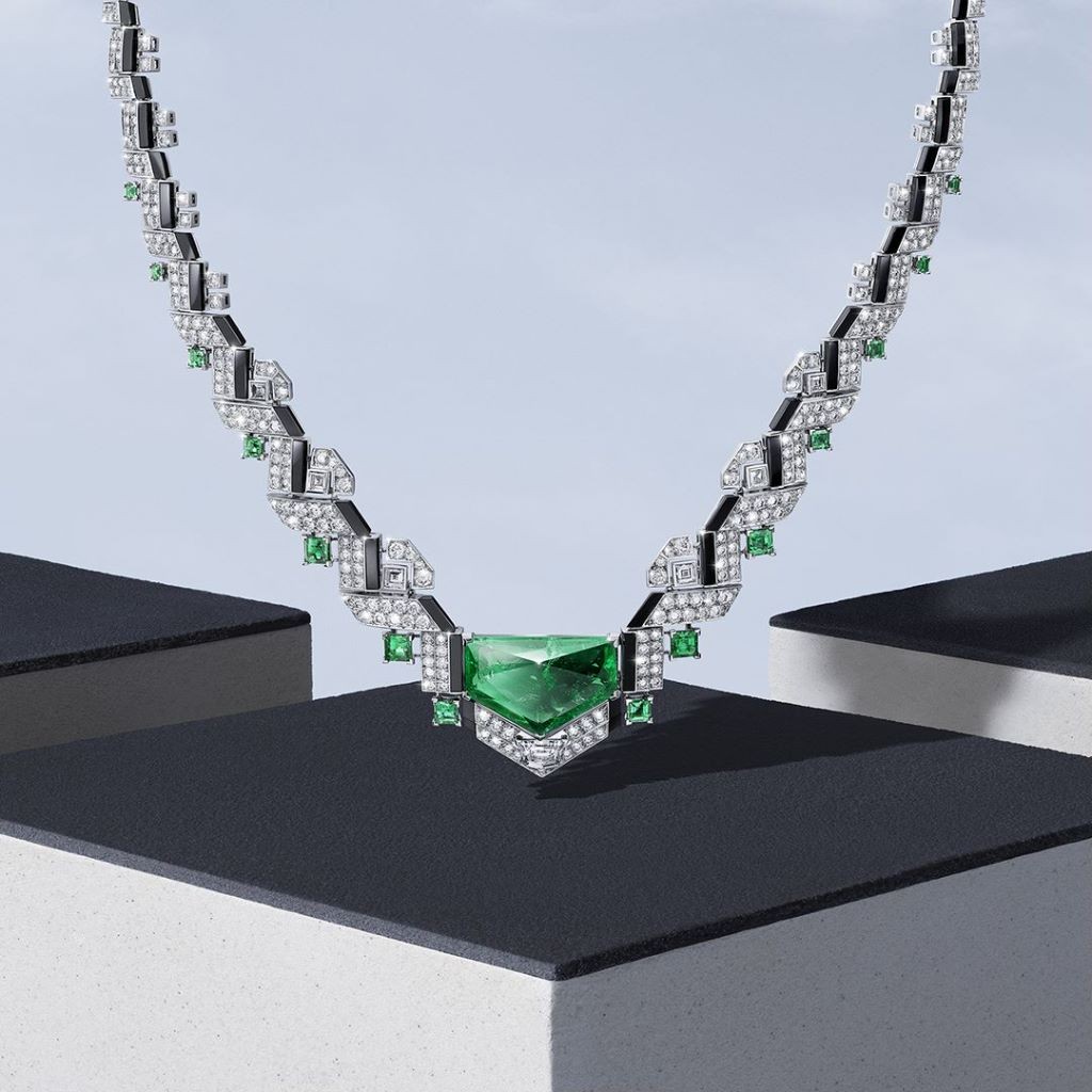 一颗14.17克拉的哥伦比亚祖母绿成为这件项链的设计出发点,它凭借独特的五边形切割而备受瞩目,并搭配一颗形状相似的盾形钻石,共同构成这件作品的视觉焦点。兼具几何风格和动感魅力的阶梯式结构中点缀方形祖母绿和钻石,营造出犹如缎带般的飘逸质感。