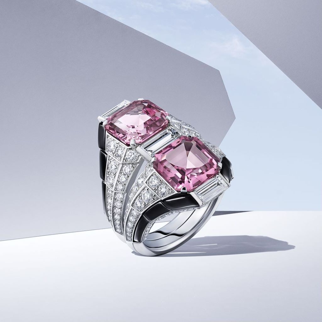 在这款戒指中,卡地亚巧妙搭配两颗形状、重量和颜色近乎相同的尖晶石,以别出心裁的方式演绎充满现代气息的“Toi & Moi”设计。一颗长方形切割钻石居于中央,将戒身结构连为一体。黑色缟玛瑙勾勒出戒指精巧复杂的轮廓线,其考究的阶梯形轮廓设计传递出层层回响与共鸣的效果。