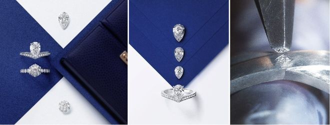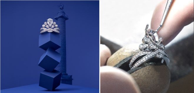 此外,CHAUMET还会在同一枚戒指上采用多种工艺,例如CHAUMET冠冕绝佳的现代表达之一:Joséphine加冕·爱系列鹭羽冠冕钻戒,运用CHAUMET标志性的特殊工艺——刀锋镶嵌法,令珠宝的金属底托趋于隐形,从而凸显中心主石;同时以独特的“错觉画法”工艺,致敬法国珠宝史上最具代表性的冠冕杰作——CHAUMET波旁·帕尔马冠冕,使极具辨识度的水滴形切割主钻尽显璀璨光华。