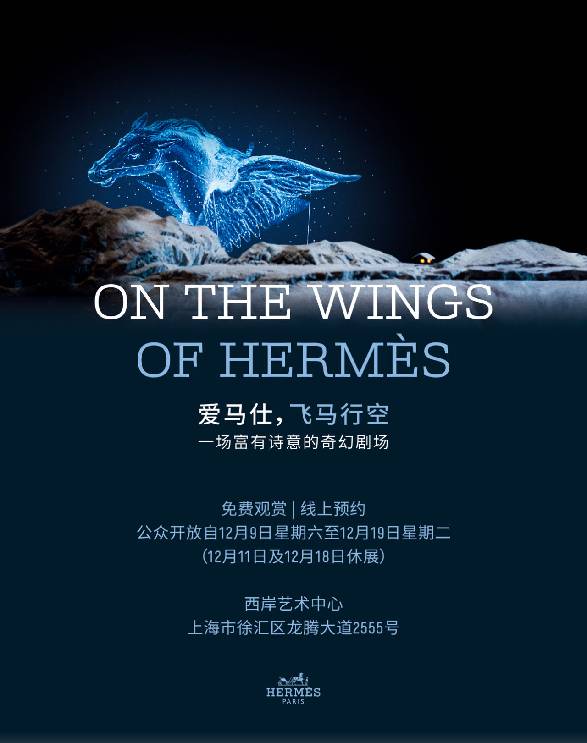 2023 年 12 月 9 日至 19 日期间,爱马仕将于上海西岸艺术中心倾情呈现《爱马仕,飞马行空》奇幻剧场, 由比利时导演 Jaco Van Dormael、编舞家 Michèle Anne De Mey 携手 Astragales 舞团,以"轻盈"为主题,融合 诗意与电影美学编织出如梦似幻的奇境。
