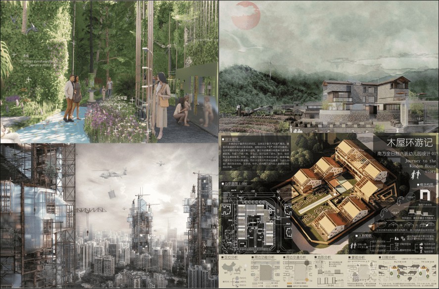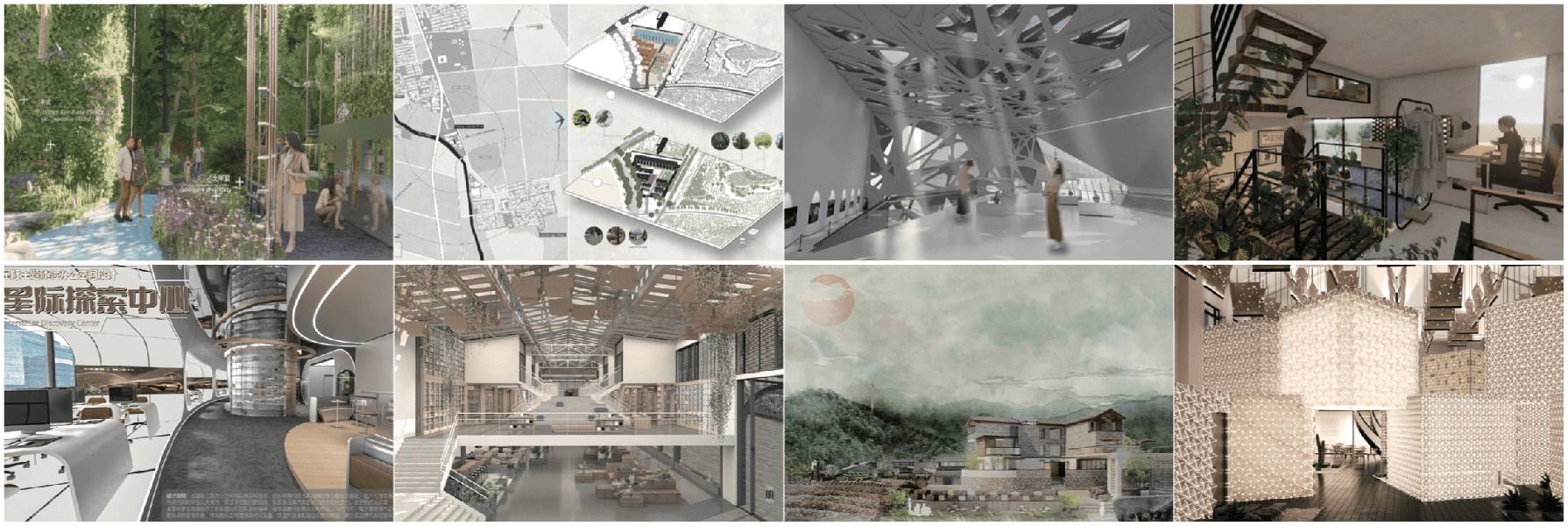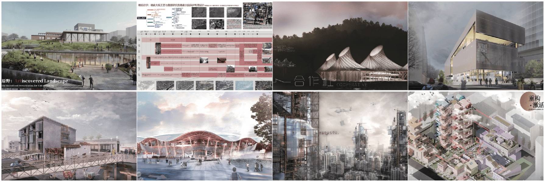[1]从左至右,从上至下依次为:建筑组金奖《原野:Artiscovered Landscape》陈锴乐、王子骏(清华大学);建筑组银奖《杨院访学:研究杨家大院保护利用设计》崔肇麟、简俊任、王沛然(东南大学);建筑组银奖《合作社——黑崖沟村观光农场设计》薛雅宁(中央美术学院);建筑组铜奖《上海棋院项目(都市峡谷)》张学硕(同济大学);建筑组铜奖《古城新生—— 松阳名都百货片区改造更新》张悦煦、温钰珑、郑捷、陈罗卓、黄钰淇(广州美术学院);建筑组铜奖《水哗——体育综合体设计》丁一凡、曹宇辰(湖南大学);建筑组铜奖《摩天营救》张为清、邢惠玥、程万景(上海大学);建筑组铜奖《重构·激活》邓玥、廖嘉佳(湖北美术学院)