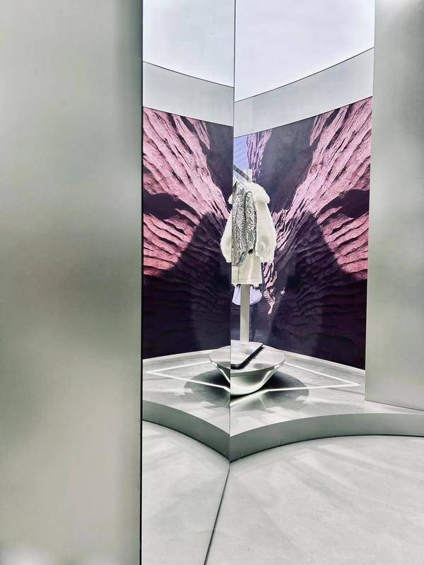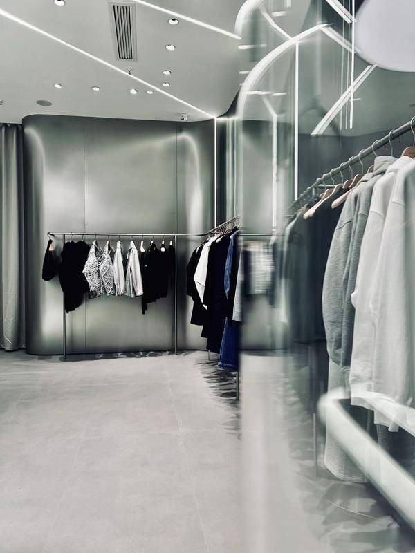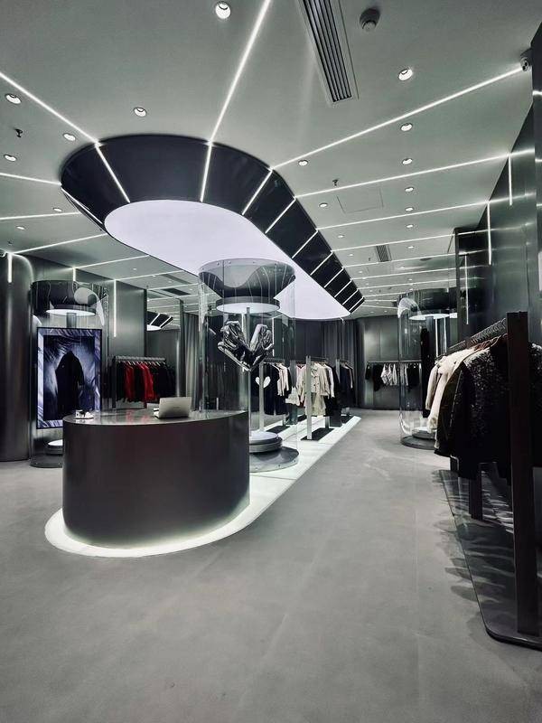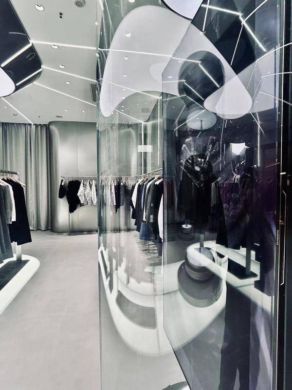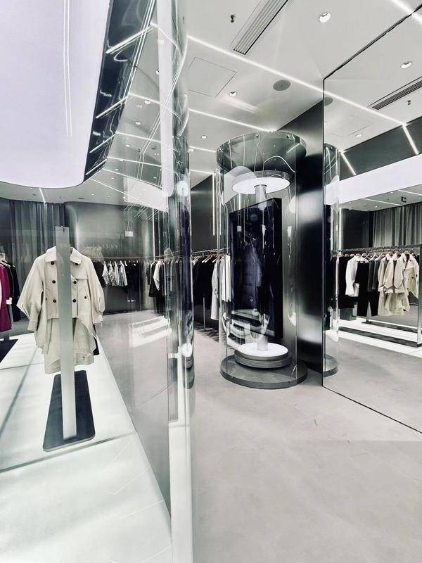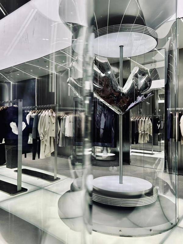 在光影的巧妙配合,店内陈列的时装如雕塑艺术品,创新技艺的先锋感与生活理念的松弛感和谐共生,体现在每一件立体剪裁与利落廓形的时装上,此刻建筑与时尚达到完美融合。
