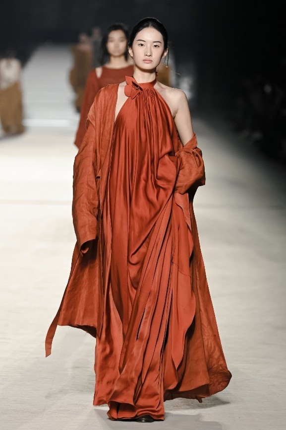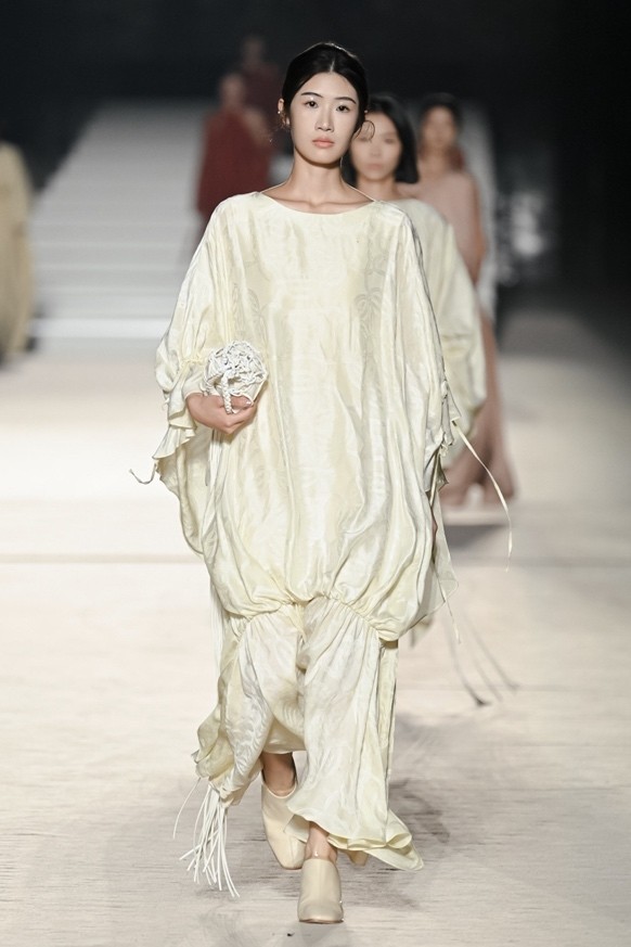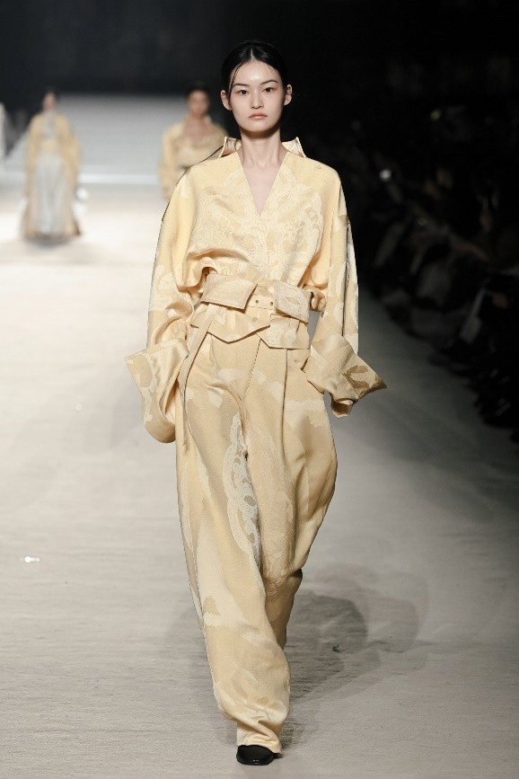 西方剪裁重在“塑形”,是形体的解码与重组,强调“我”为独立个体。东方剪裁大象无形,一气呵成,意在如“是”。「例外」始终追求更自然、全然的风格叙事,从纤维、织法就开始设计,贯穿整个供应链上下游,为整个品牌的设计生态服务。在现代时装设计的语境中,传统文化内涵被重新修复、考量、思索、直面。当被延伸至秀场上,传统与创新、民族与世界的涵义经受审视——通过“我”去感知“是”,通过个性去感知共性,通过有形去感知无形,通过民族去感知世界。
