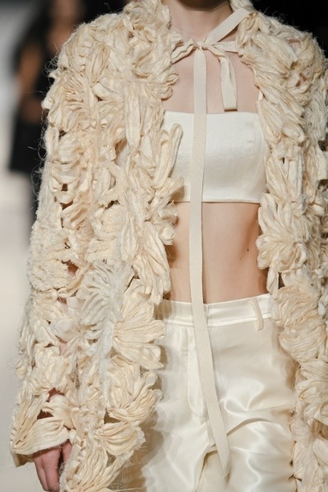 在色调上,「大观·定觉」系列以空色白、玉子黄、建盏黑、青云蓝、浮烟青,等色彩,唤醒人们对东方的诗意想象。自然主义的设计理念与超然大方的轮廓,精简至极,仅余核心。在面料上,「例外」擅长让原材料回归自然姿态,并融入现代日常着装。雨时醋酸、冉竹丝麻、轻舟丝毛、子也提花、临灵丝、素初牛仔等精致面料,在如东方蕾丝般编织的锁链绣和盘绳绣的点睛下,塑造出如软雕塑一般的立体造型,呈现出别具一格的简约新中式女装。