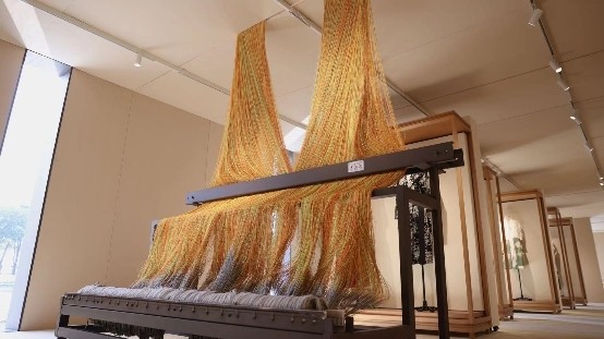 展览内容丰富多元而贴近历史,由浙江理工大学团队手作的「绫罗绸缎」大型纺织面料装置、《寻找缭绫》影像纪录片以及天一纺织提供的纺织机零件装置等展品和大量的文献,完整记录了缭绫的前世今生。透过对缭绫的传袭再造,延伸曾经辉煌的唐宋织造文化技术,让人们看到传承中从不缺席的美的创造力。