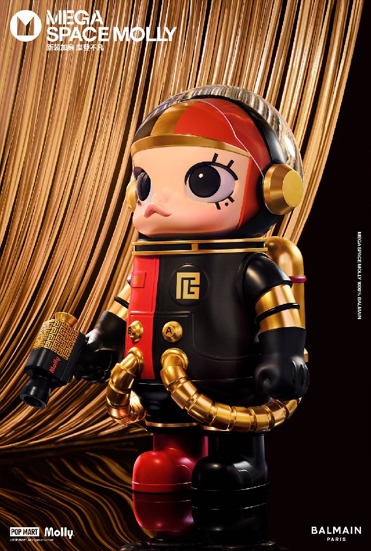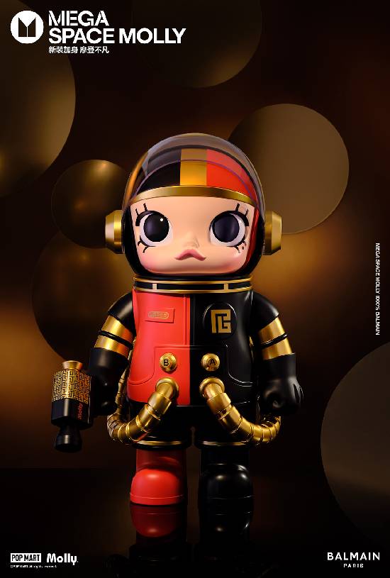 2024年1月5日,泡泡玛特联动法国时装屋BALMAIN重磅推出开年新品MEGA SPACE MOLLYBALMAIN联名系列,全球限量699体,引爆开年热潮。泡泡玛特以潮流先锋的姿态不断探索新锐流行趋势,全新联名产品结合BALMAIN 标识及品牌经典元素,运用极具视觉冲击力的红黑配色呈现多元风格,打造高端潮玩收藏品,描摹新世代的自由与前卫精神。