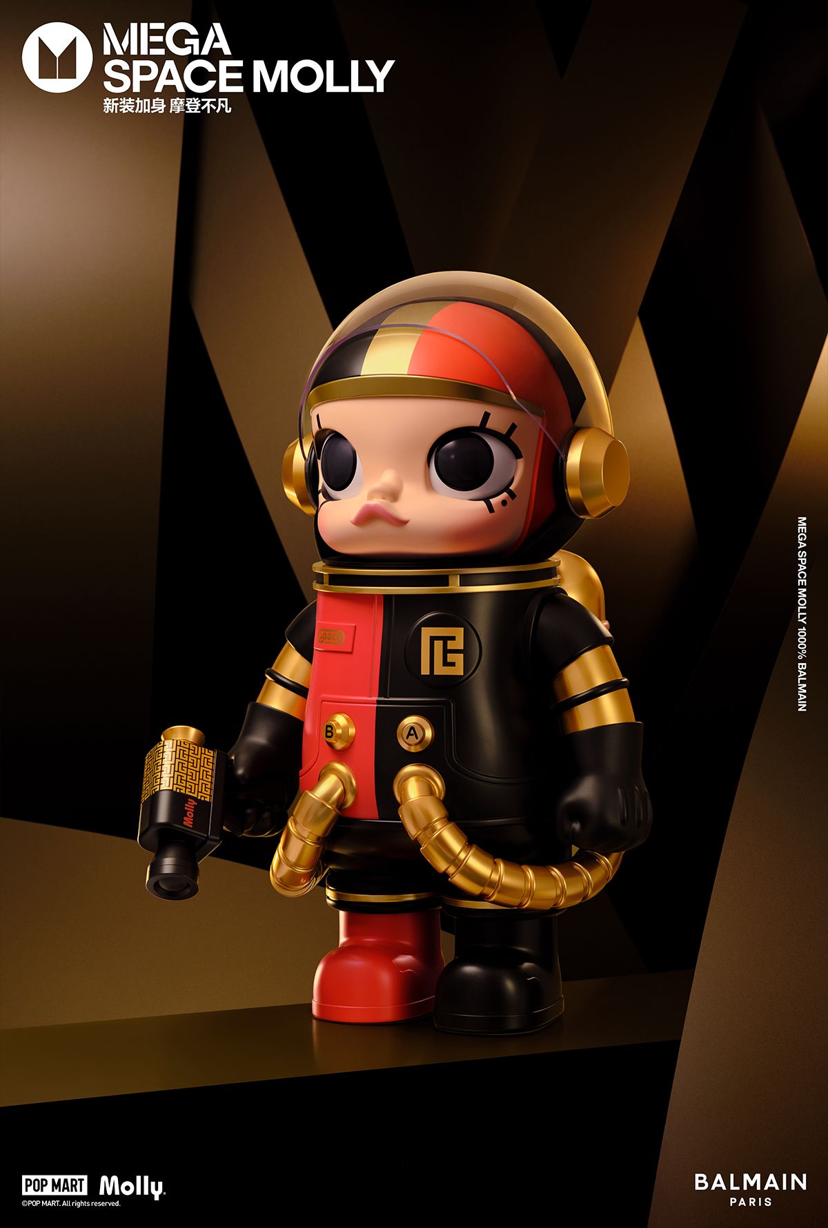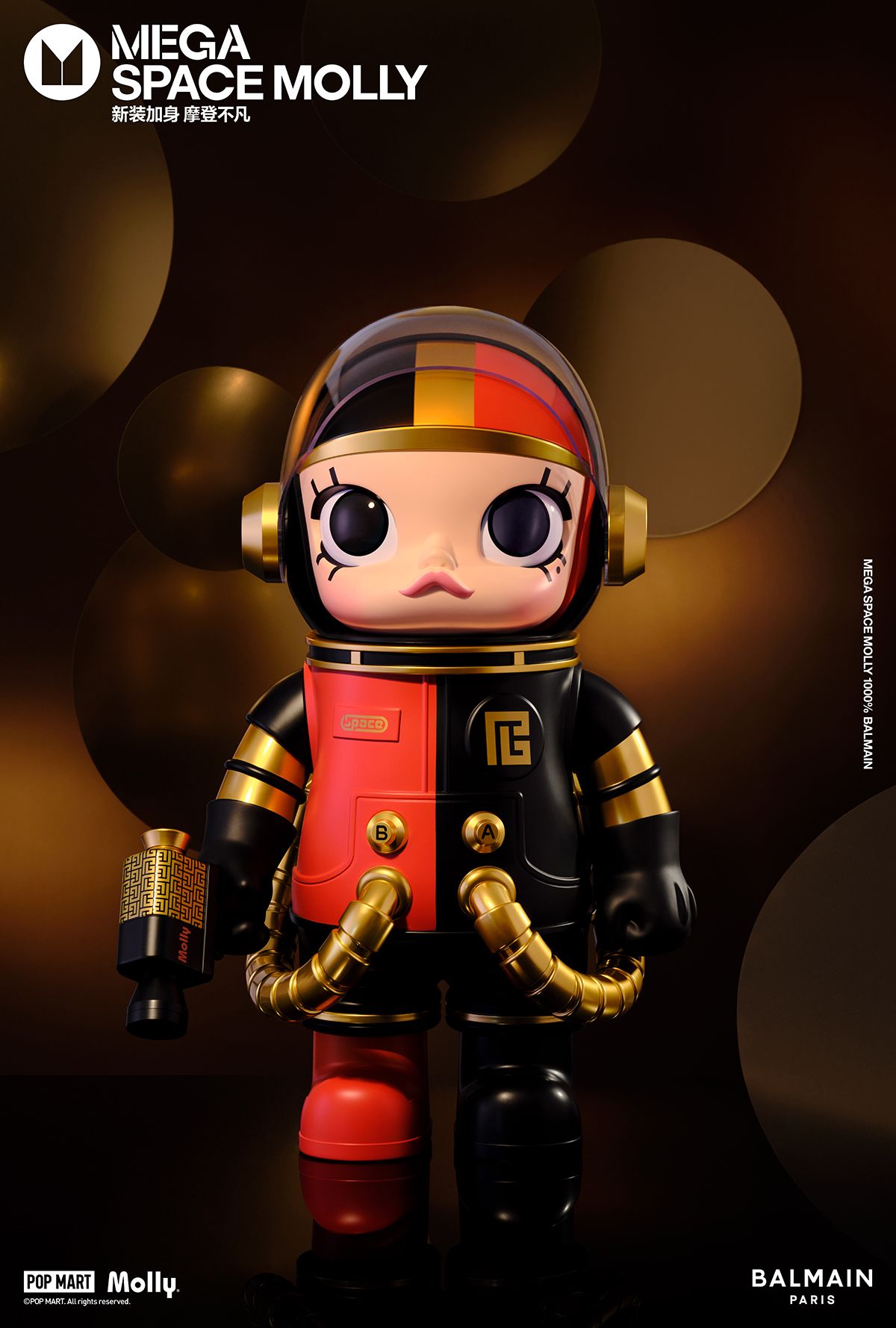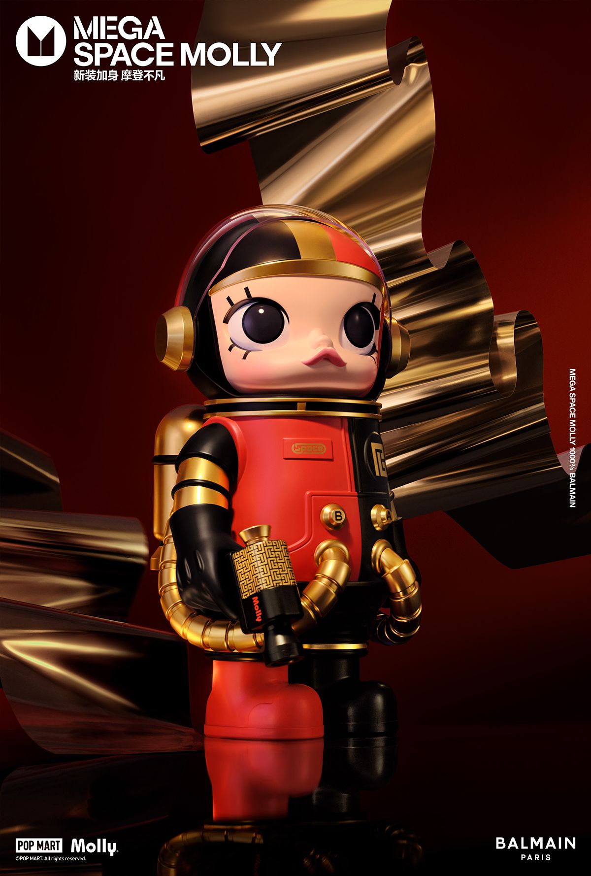 MEGA SPACE MOLLYBALMAIN将BALMAIN极具辨识度的摩登调性融入泡泡玛特SPACE MOLLY的未来感中。MOLLY身着定制时装,一身红黑配色英气十足,金色的BALMAIN经典MONOGRAM图案以及公仔襟前的两颗金扣再现经典法式风格;公仔头盔后方独有的BALMAIN复古包扣设计更是点睛之笔,为整个公仔刻上了BALMAIN印章,延续品牌潮流基因,演绎时尚隽永格调。此次联名公仔为1000%,作为MEGACOLLECTION在2024年的开年款发售体量极少,是收藏家和潮玩爱好者们的不二之选。