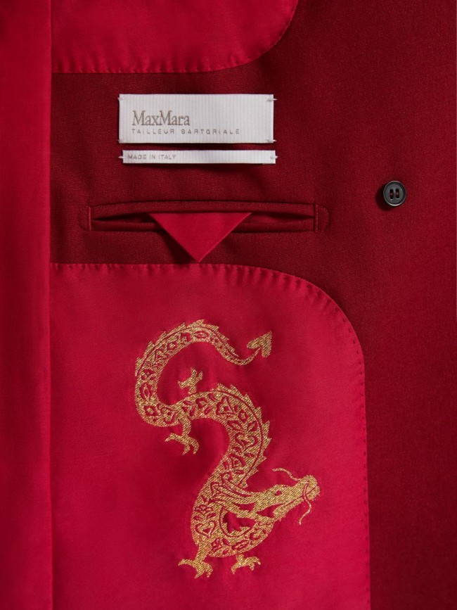 一系列精选单品采用经典的黑色和绯红色设计。精致的短款泰迪熊大衣、运动风格的泰迪熊拉链飞行夹克以及时髦大衣,均选用浓郁红色调呈现;衬里则饰有当季流行的龙形图案。西服上装源自 Max Mara 2024 春夏 Tailored Suit 特别企划项目,以明艳红色调演绎,配以专为龙年打造的特别衬里。此系列亦推出印花衬衫和富有趣致的针织衫,打造考究不凡的整体造型。花卉印花着染深浅不一的红色调,令人想起斯堪的纳维亚的野花花环。渔夫帽、棒球帽、运动鞋及闪亮胸针等配饰单品,为整体造型添上点睛之笔。