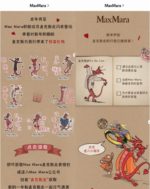延续兔年新年特别企划“法多歌兔Max”的旅程,今年依然由 Max Mara 创意总监 Ian Griffiths 亲自配音,讲述 MAX 与 LT 的奇幻的新春系列创作灵感故事。此外,Max Mara 还以麦克斯龙故事为主题,在微信推出“麦克斯龙,有话要说”表情包;同时上线“麦克斯龙年很忙”互动小程序,发布龙年限定红包封面以及精美壁纸。用户可以通过品牌官方微信小程序,与小龙麦克斯 MAX 与他的伙伴小泰迪熊 LT 一同历险,解锁相应福利,参与互动。
