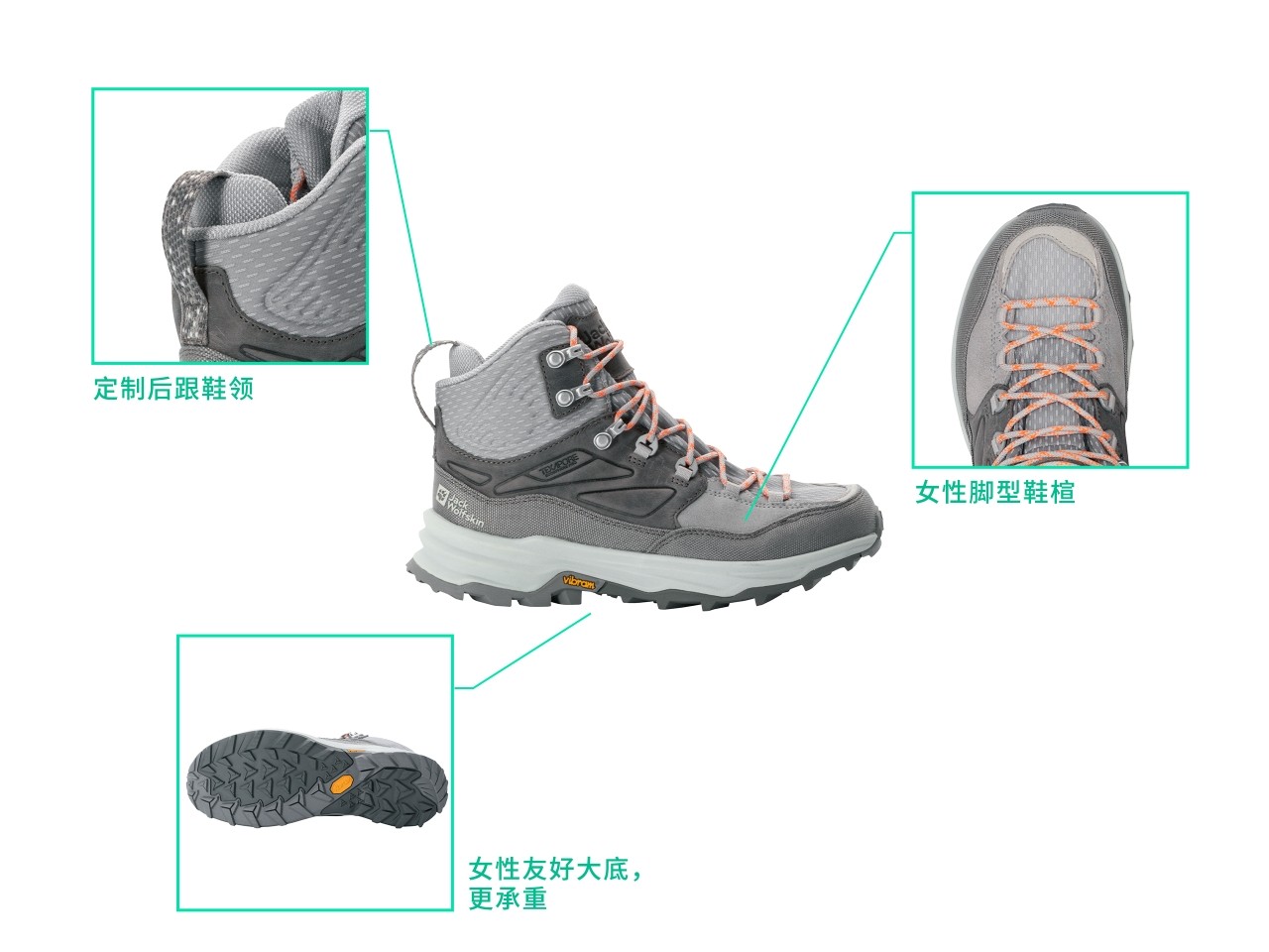 女性友好大底:定制Vibram大底,展现超强抓地力,承重更均匀。