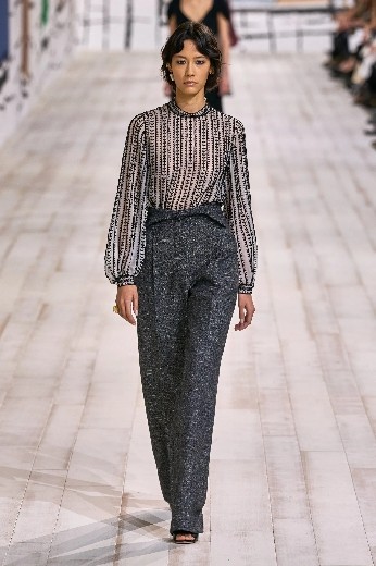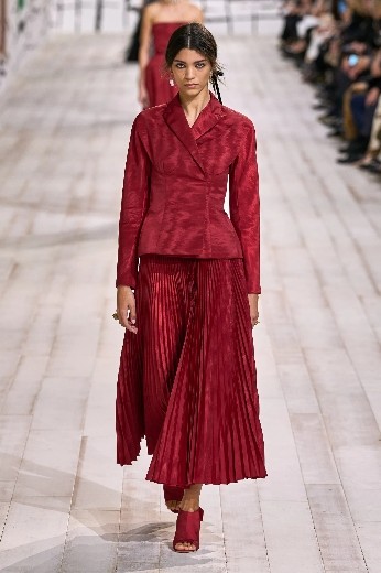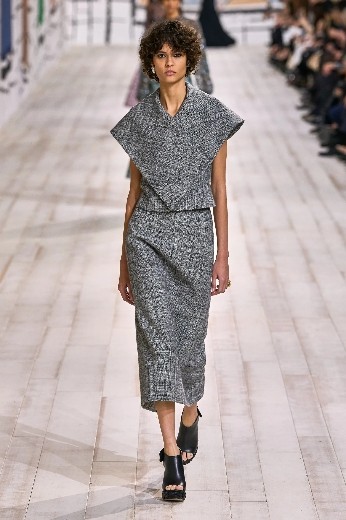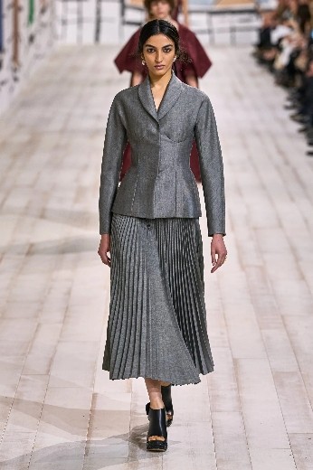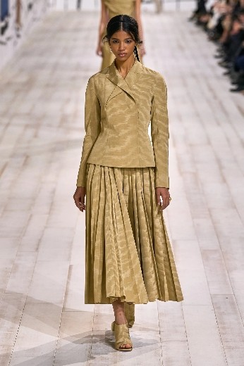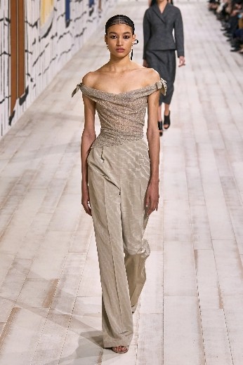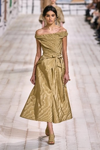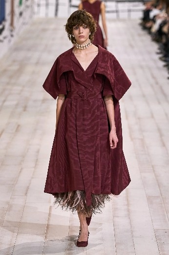 “如同冬日里层层漾开的波浪”—— “极具雕塑质感的3”云纹绸面料2携耀眼的金色、白色、 灰色、酒红色和绿色,焕新演绎迪奥典藏礼服 LA CIGALE 的几何线条,营造优雅建筑美感,呈现于本季作品之中:如饰有华丽衣领的大衣、夸张镂空设计的阔摆裙、交叠的层次设计,以及裤装与夹克。本季高级订制系列亦借鉴迪奥典藏礼服的廓形细节,重塑摩登造型。丝棉面料以风衣式色彩呈现,兼具时装魅力、创新精神与经典格调。