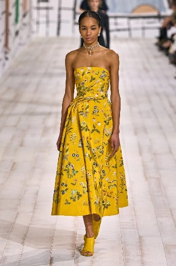 黑色天鹅绒礼服裙于举手投足之间,展现万千韵动之美;质感上乘的羽毛斗篷轻覆于双层刺绣欧根纱礼服裙之上,碰撞出华贵典雅气息;刺绣宛如石碑上的古诗集片段,予人无尽遐想。该系列亦再现了自然的多元和生机,黄色云纹绸礼服通体点缀“千花琉璃”(MILLEFIORI)图案,纤长织线则随步伐摇曳起舞。