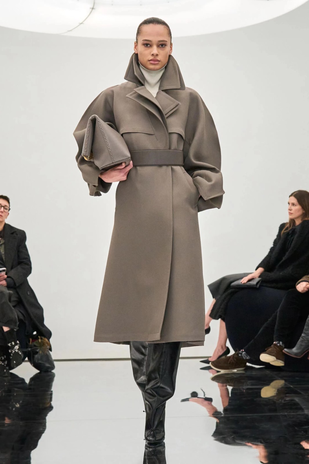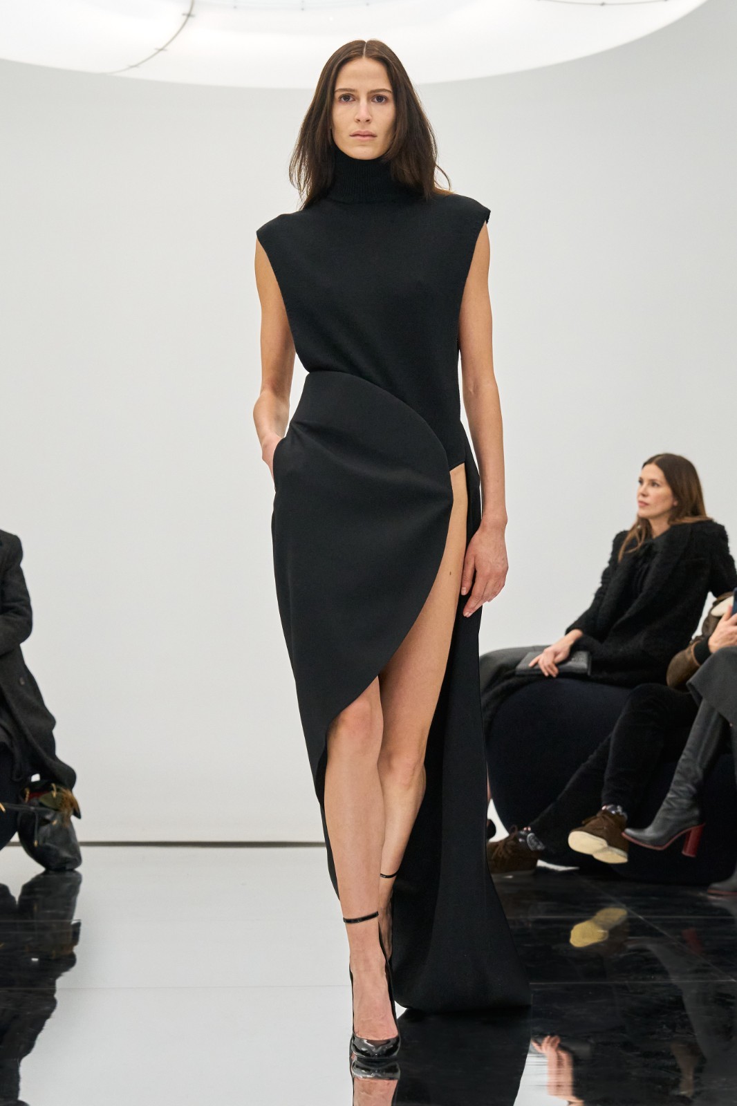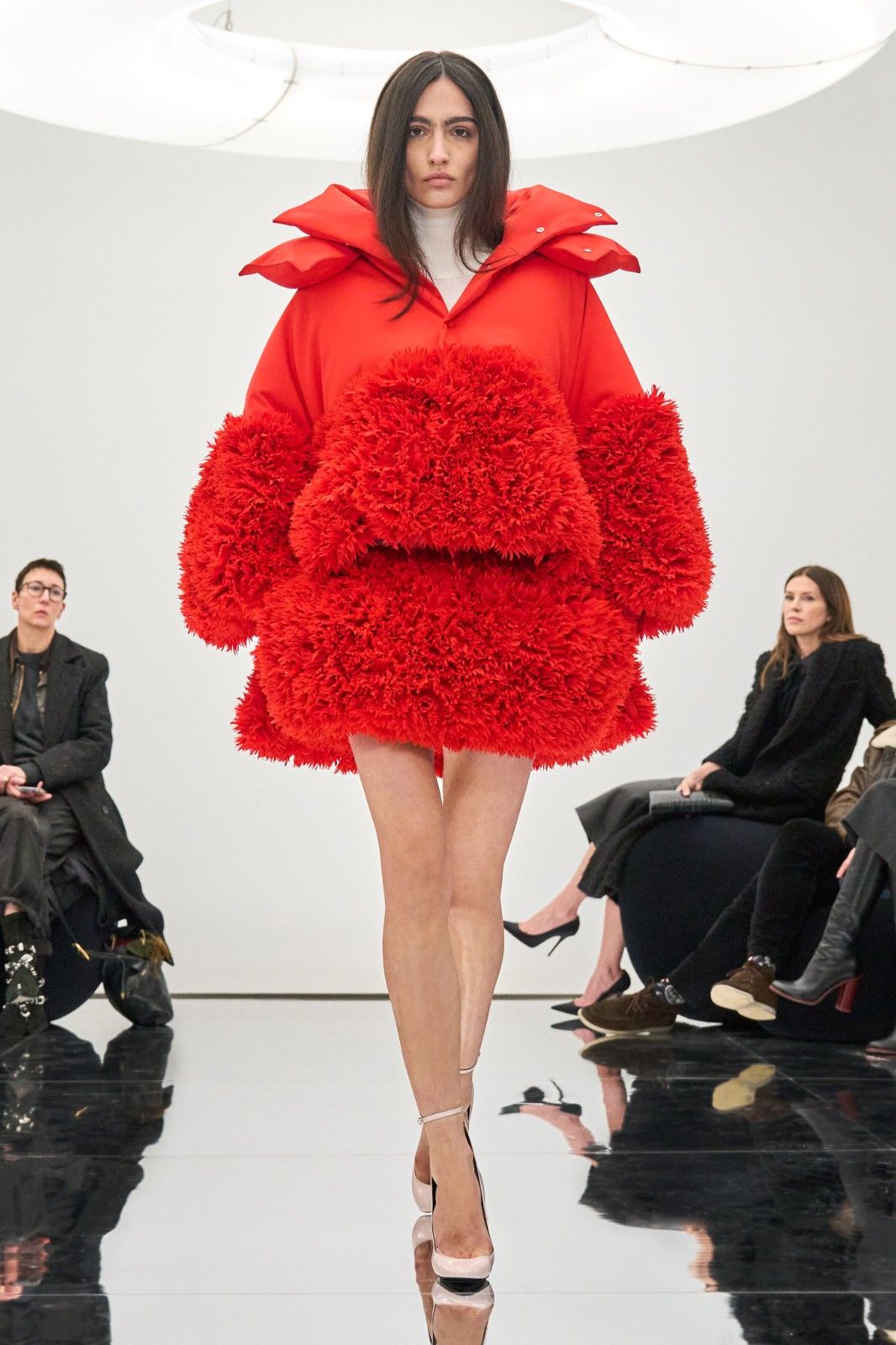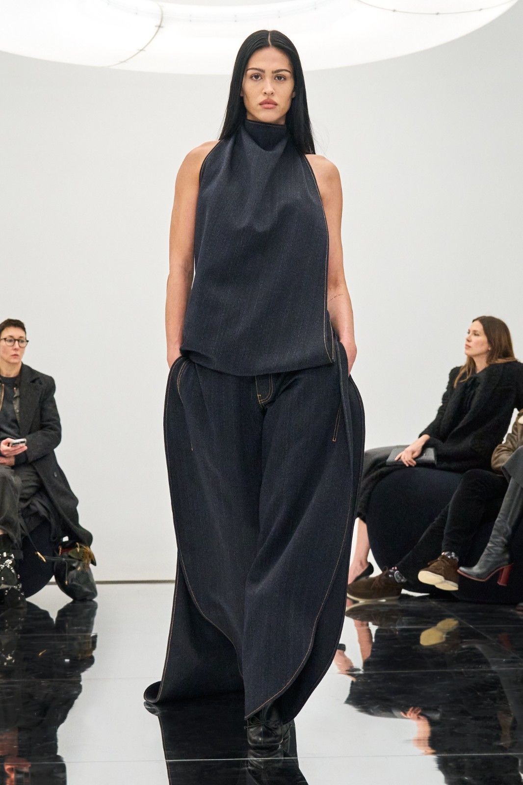 此次大秀,意在将各位聚在一起,近距离观赏时装,近距离彼此沟通。秀场将系列服装与空间设计融为一体,这种融合也正是品牌的核心特征。顶部Pelota灯具由工业设计师Marc Newson特别设计,中央圆形结构如光环一般散发光芒;Mollo沙发由家具设计师Philippe Malouin设计提供,仅以缝合线将泡沫材质压缩而成,整体丰盈而柔软。