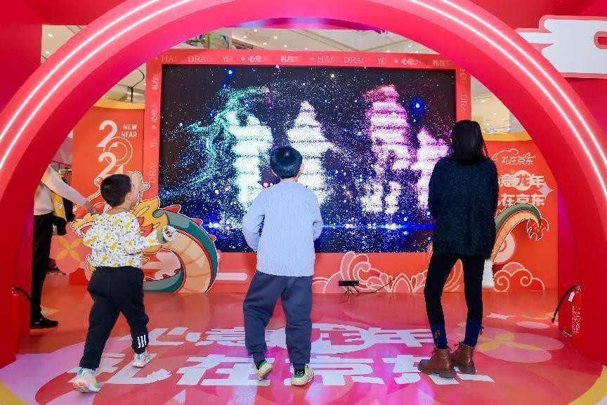 1月13日-14日,京东礼品春节集市第一站来到了上海大华光启城,集市中搭建的全息投影大屏引得人群纷纷打卡,只要在屏幕前做动作,屏幕中就会出现姿态影像,互动性十足。