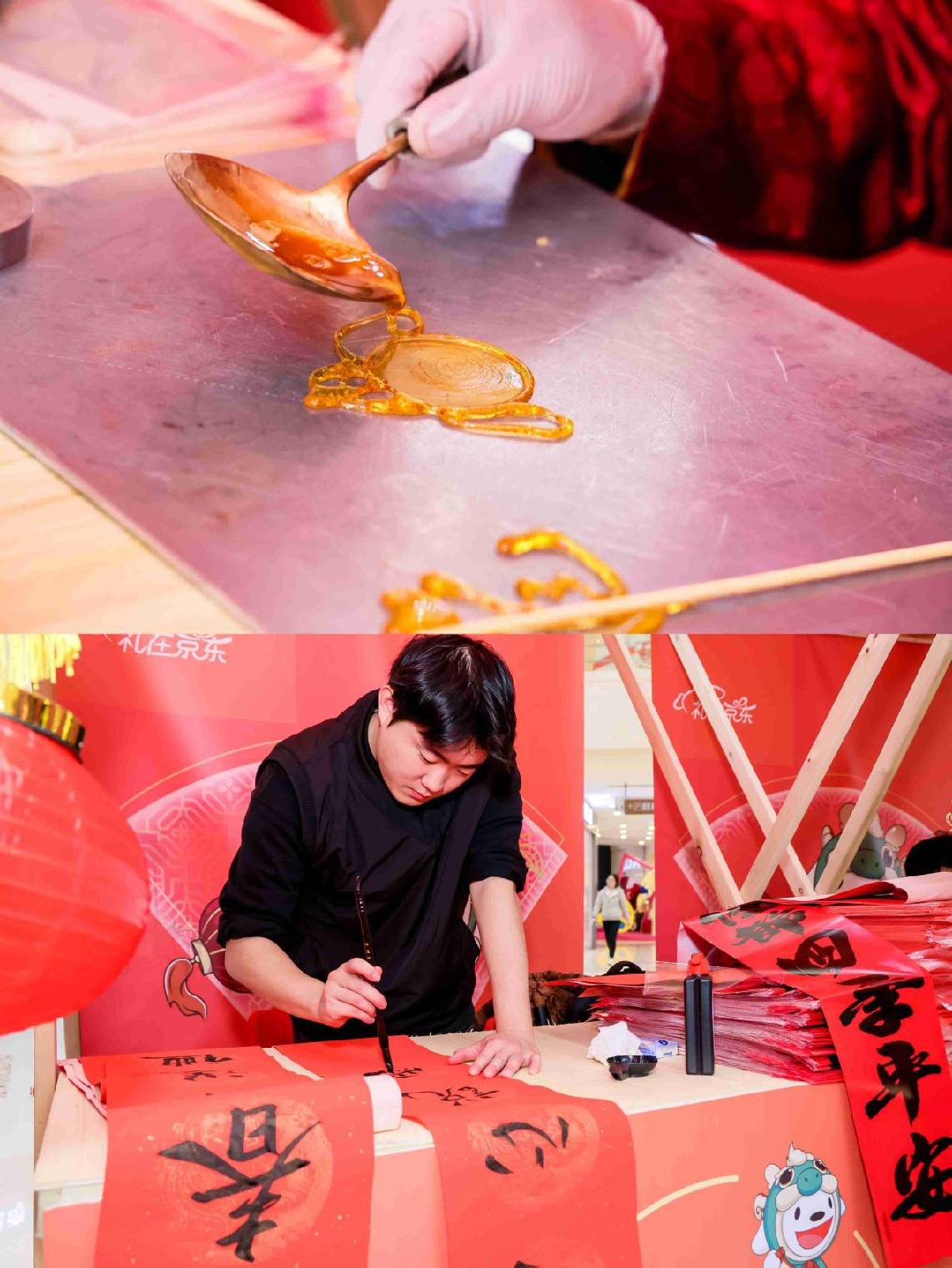 消失在日常生活里的糖画,也是打卡的热门摊铺。当用手指拨动转盘,思绪就倒转回了儿时,等到指针停止,糖画师傅就会为你做一个专属糖画了。感兴趣的话还可以写写对联,为家附上亲手撰写的春节祝福。