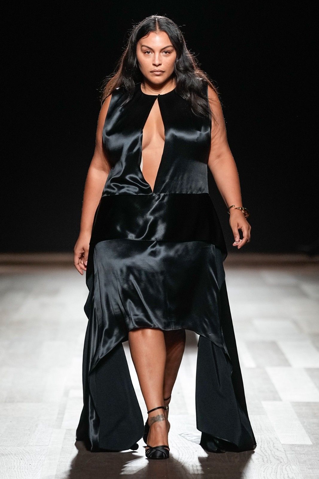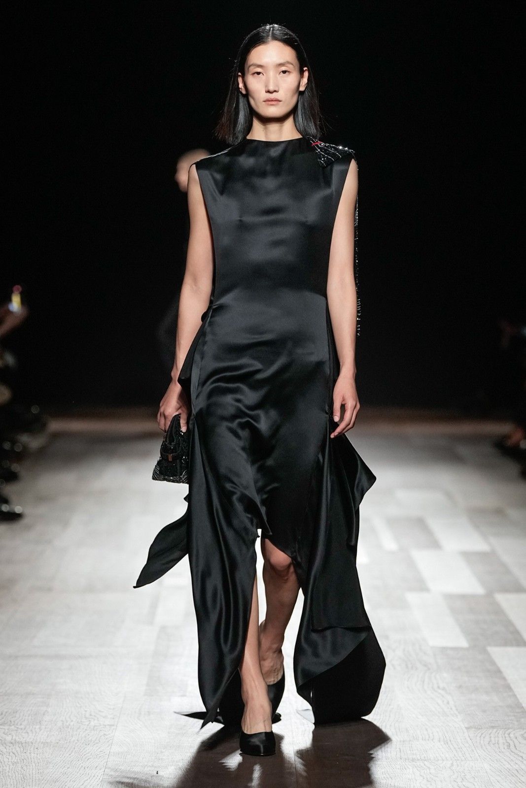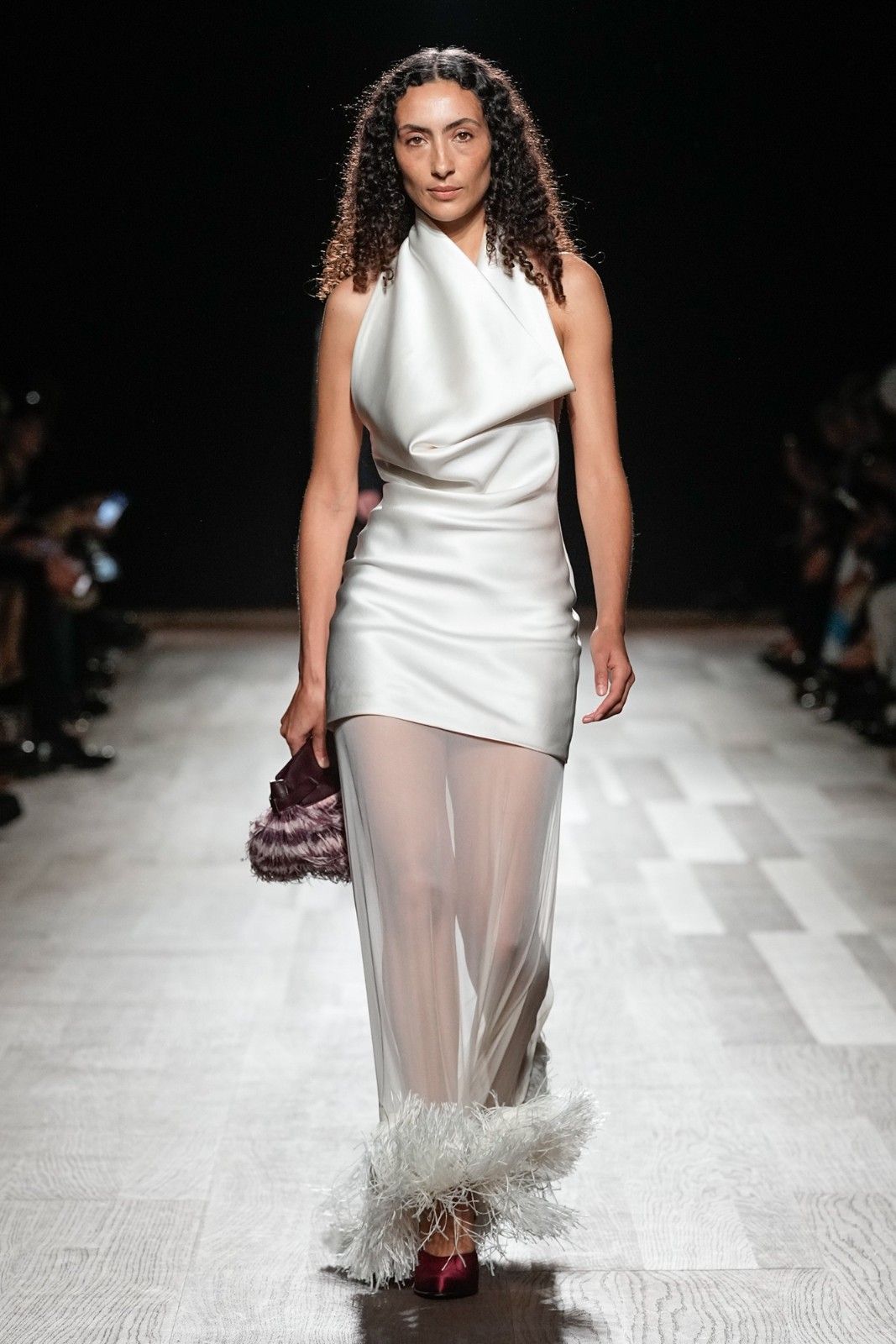 该系列优雅呈献漆艺薄纱礼服,饰以格外柔美的透视元素、羽毛饰面与亮片刺绣。与此同时,本季亦致敬琼·克劳馥(Joan Crawford)与葛丽泰·嘉宝(Greta Garbo)等先锋女性的洒脱气质,以宽大肩型、重磅羊毛以及柔韧皮革塑造硬朗廓形。剪裁手法方面,利落雕塑感翻领彰显超现实主义精神,其比例经过扭曲变构,形成仿若物影肖像摄影的别致效果。Ferragamo典藏档案中的经典之作毯形斗篷,如今幻化为保护自我的庇翼。Maximilian Davis解读道:“1920年代,在周遭环境的驱使之下,人们通过地下酒吧营造出专属空间。他们全程掩藏着自己的穿着,直至抵达安全的环境。”