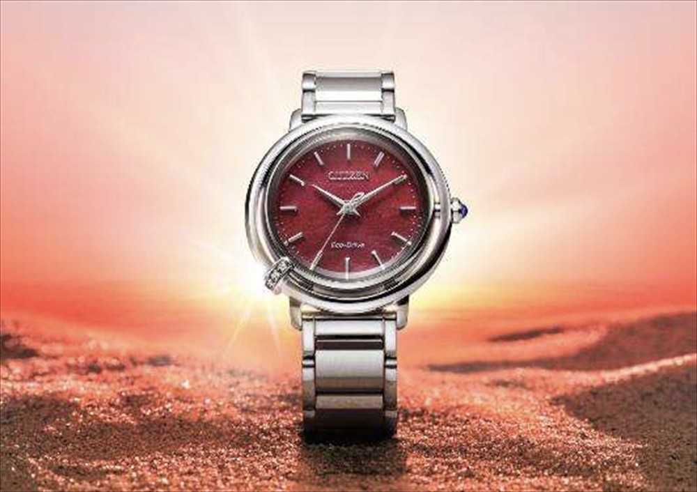 CITIZEN L花语风吟系列2024年新款腕表,以日出作为设计主题,象征着新的开始。钻石的设计排布充满了故事感,营造出旭日迸射第一道光芒的观感。表盘使用了再生材料,犹如被日出染红的天空。附赠一条可持续的苹果皮革表带。这款腕表将对地球的关爱之心以及对长期陪伴的珍爱之情具现于腕间。