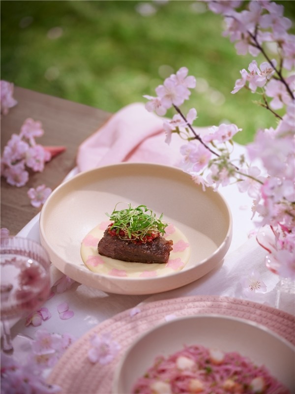 盛樱满开,对应主菜主食:自然不赶时间,值得慢慢去看。为还原盛樱满开时期的绚烂,不仅在造型上复刻了樱花的形态,还加入了樱花糖、盐渍樱花等多种形式的樱花食材,慢炖熬煮,为餐品注入更加馥郁的樱花味道。