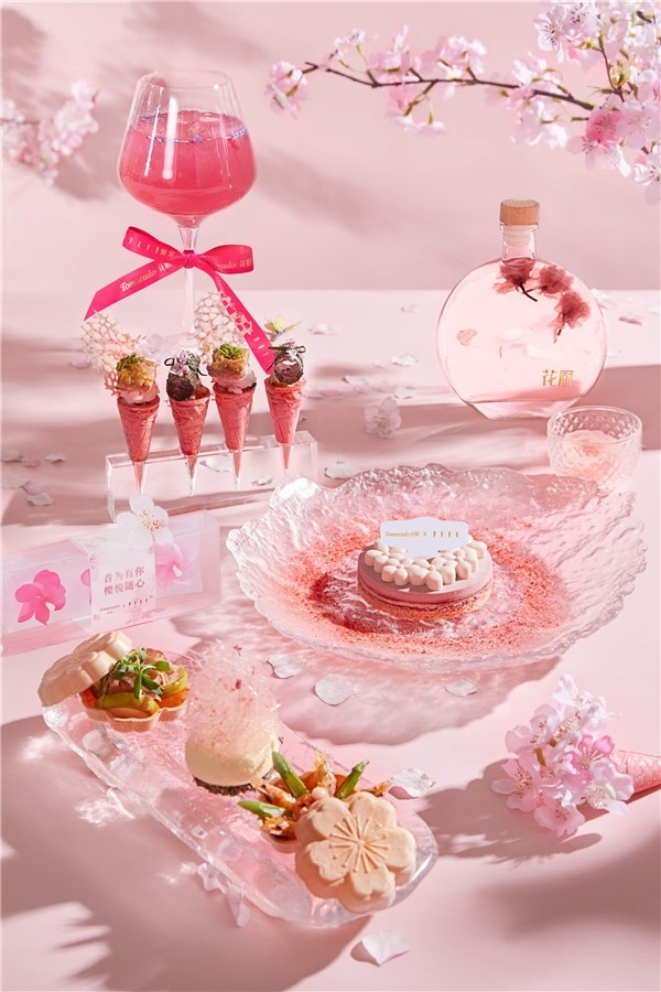 落樱缤纷对应饮品甜品:最美的浪漫,有时最后才会出现,作为一餐的结尾,甜品及饮品不仅在摆盘上模拟樱花飞落时的唯美形态,层次丰富且悠长的回甘,也像整季樱花之美一样令人回味。