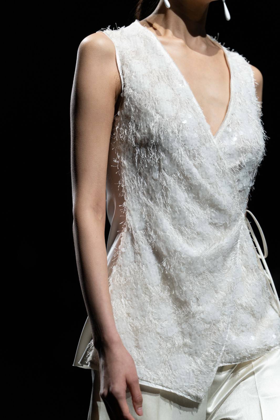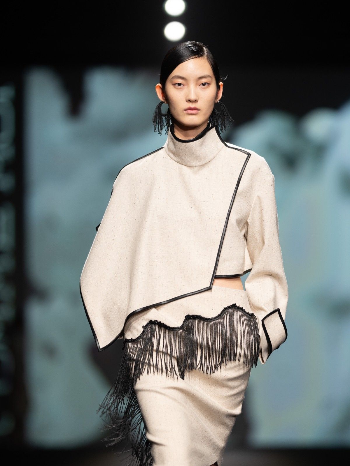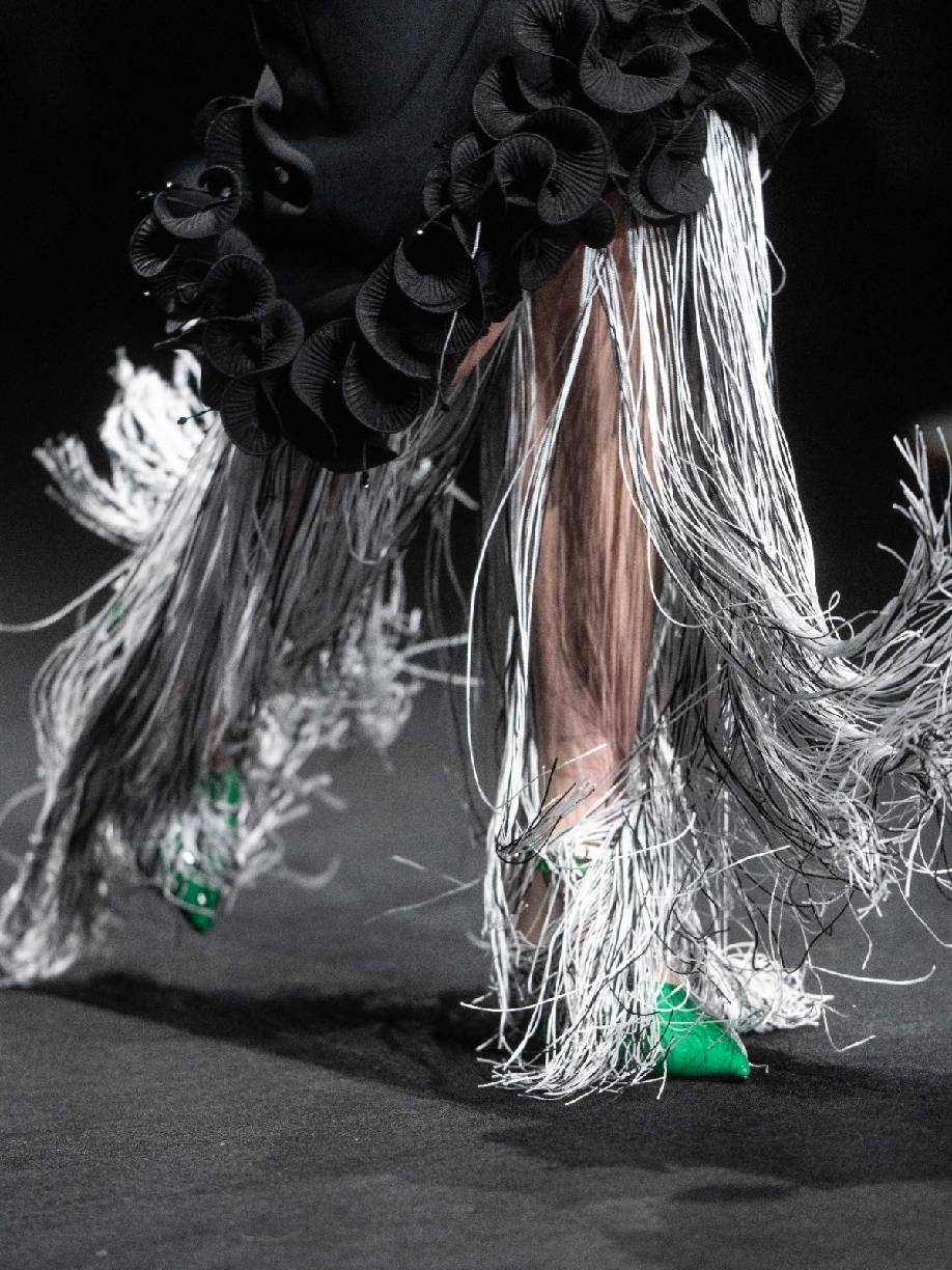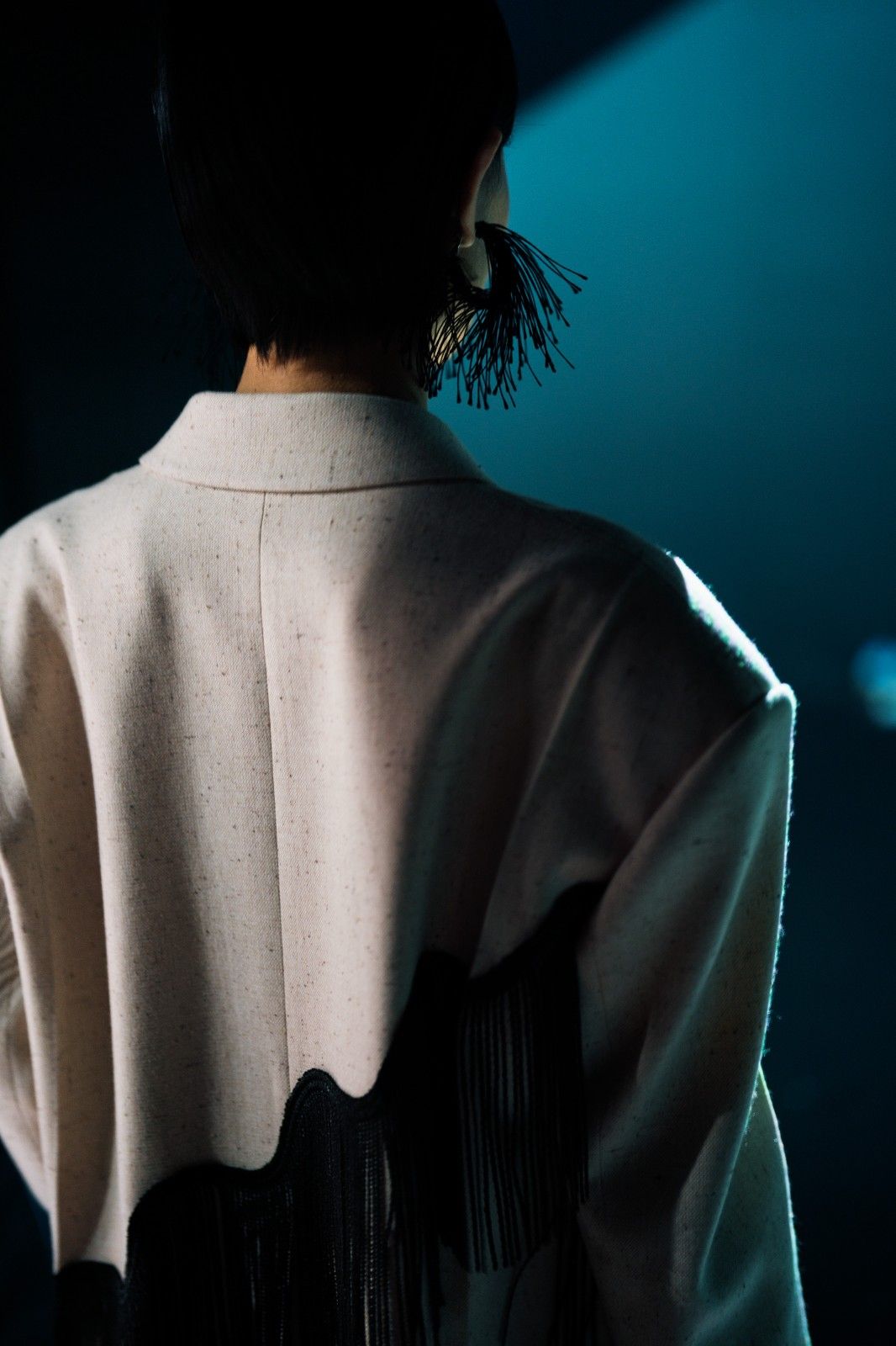 温顺的流苏贯穿时装系列的始末,修饰着COMME MOI标志性的利落廓形,或者停留于裙摆和肩 部。全手工缝制立体流苏工艺,完成了尤为充沛的表述。