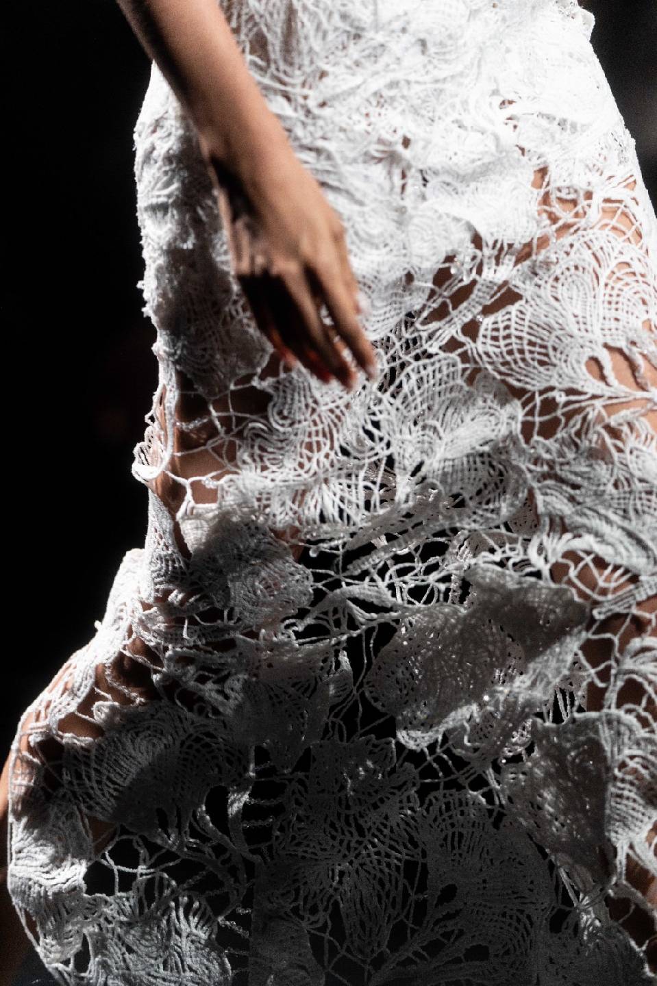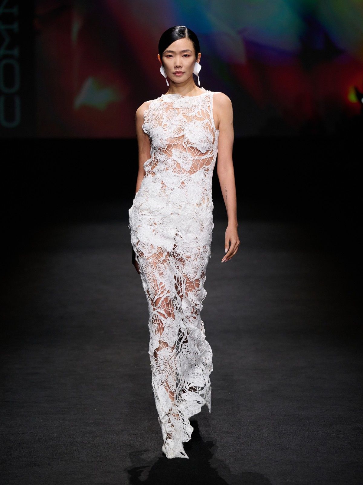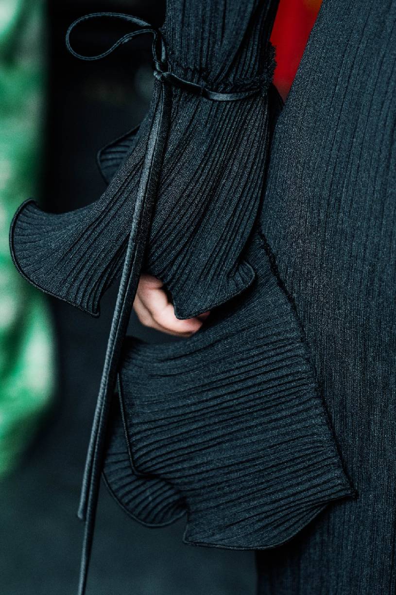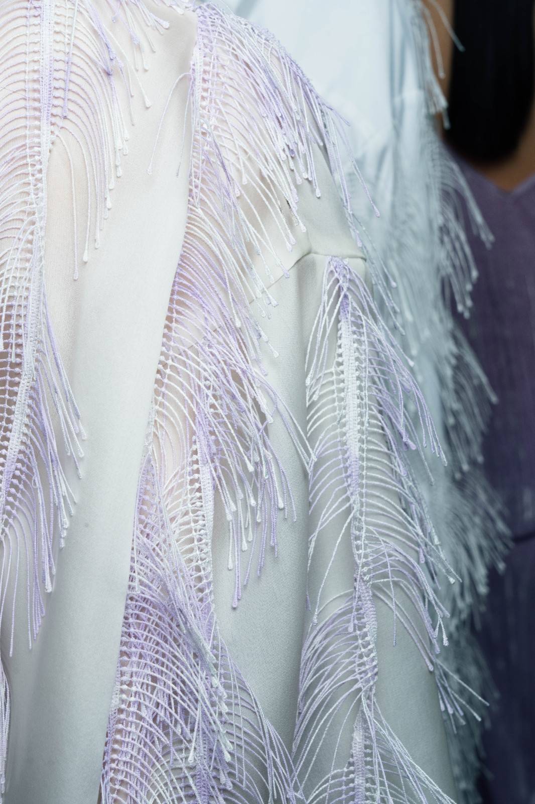 温顺的流苏贯穿时装系列的始末,修饰着COMME MOI标志性的利落廓形,或者停留于裙摆和肩 部。全手工缝制立体流苏工艺,完成了尤为充沛的表述。