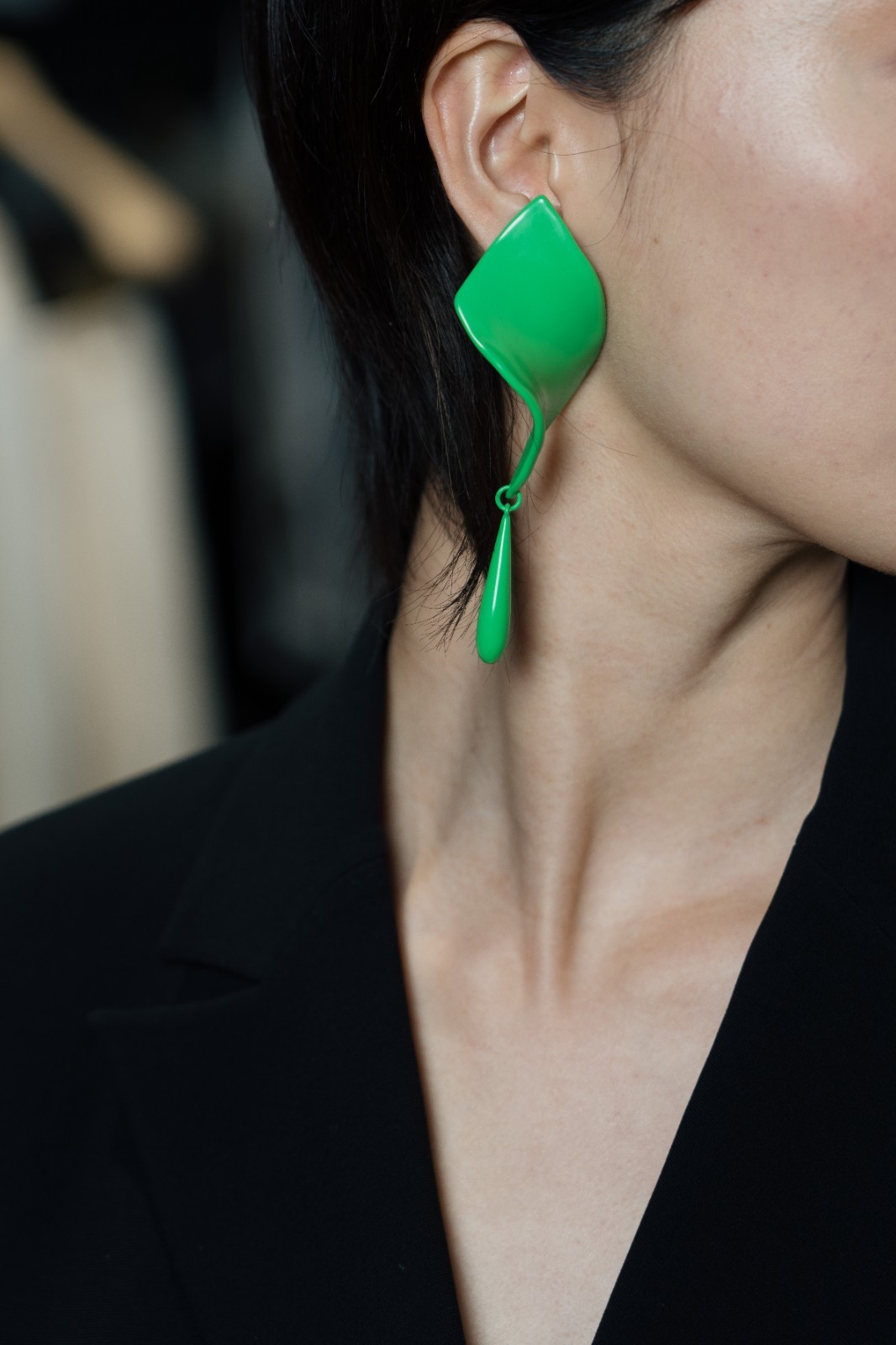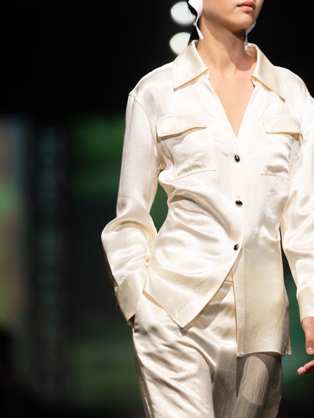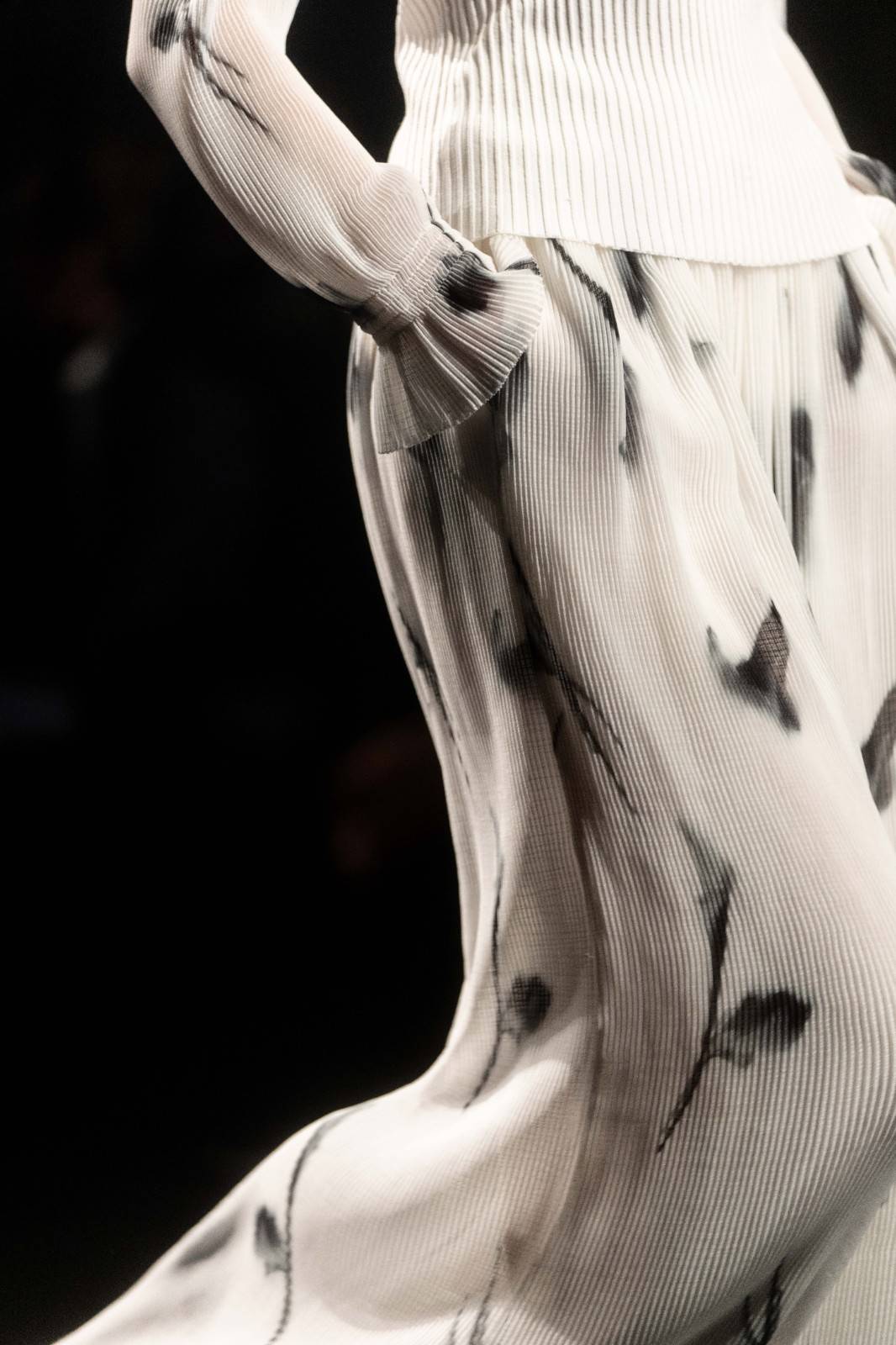 一系列为轻盈春夏而为的面料——轻盈的棉麻和压褶面料、顺滑的极短毛丝绒面料,比照着高雅灵动的缎面和真丝面料。