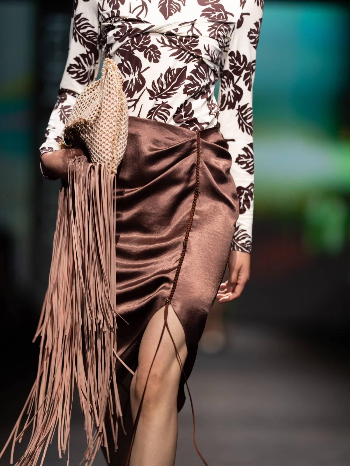 紫罗兰色晕染了弹力压皱丝绒面料,光影中变幻莫测;怡人的杏色反衬着花草图案——何不似我,探入田园?美拉德色系中的果壳棕色像是章节的收梢,⻘涩少女迎来红叶落索的时分。